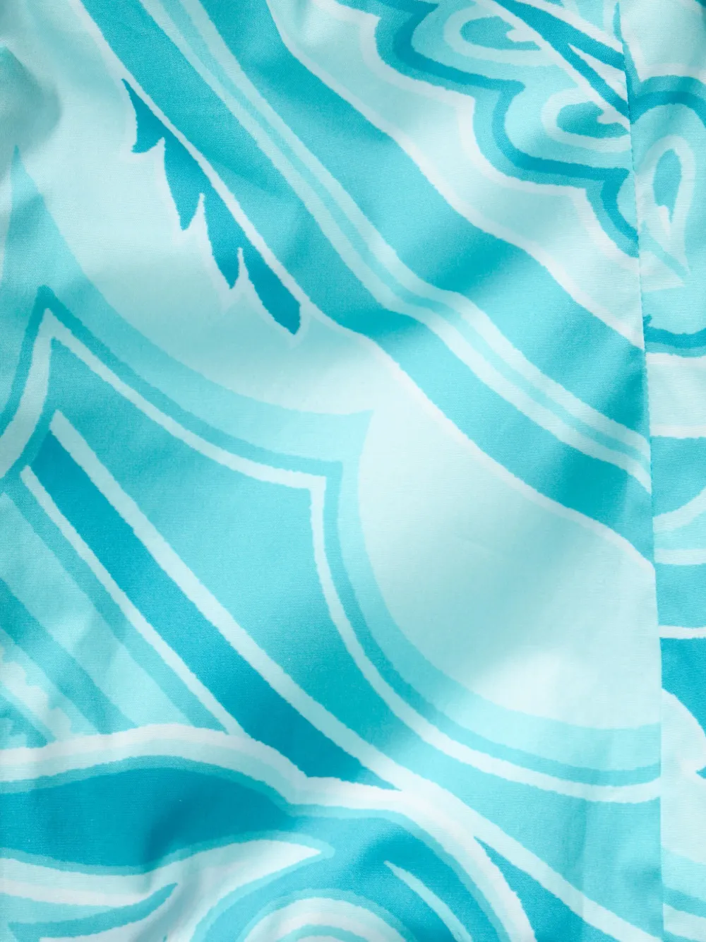 Синий, смесовый хлопок, принт пейсли, классический воротник, застежка на пуговицах спереди, длинные рукава, манжеты на пуговицах и прямой подол.