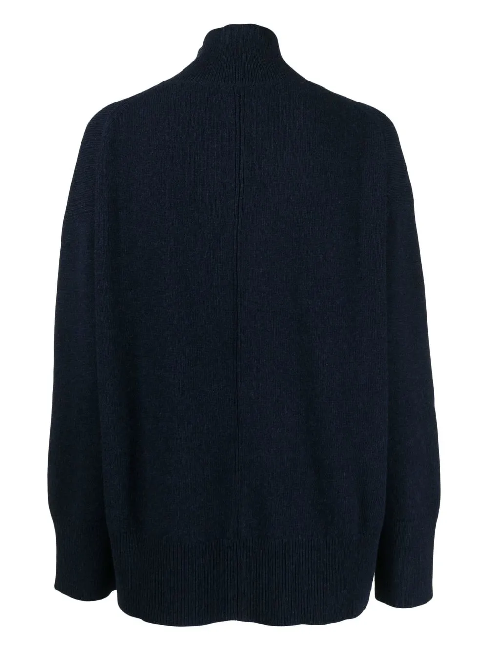 Темно-синий, кашемир, детали в рубчик, боковые разрезы, высокий воротник и длинные рукава.