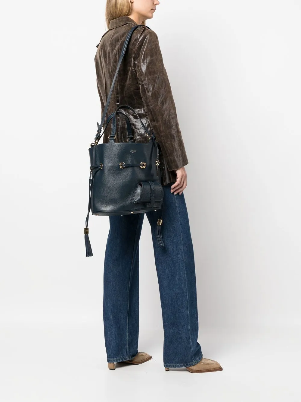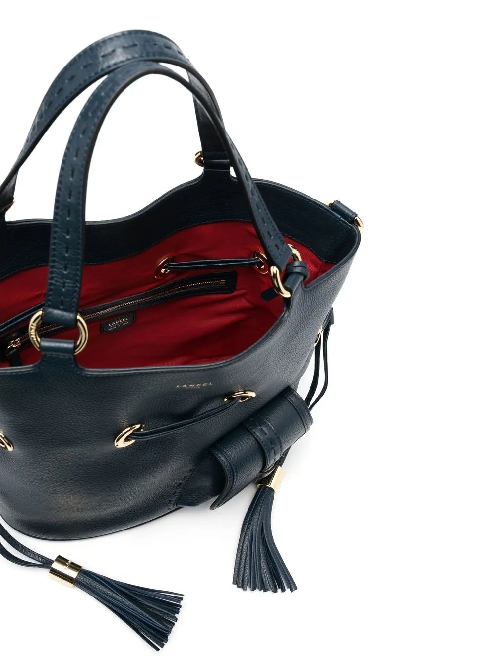 Темно-синий, телячья кожа, подвеска с логотипом, тисненый логотип спереди, декоративные кисточки, две верхние ручки, съемный регулируемый ремень на плечо, кулиска, основное отделение, внутренний карман на молнии, нашивка с логотипом внутри, передний карман с клапаном, металлические ножки и золотистая фурнитура.