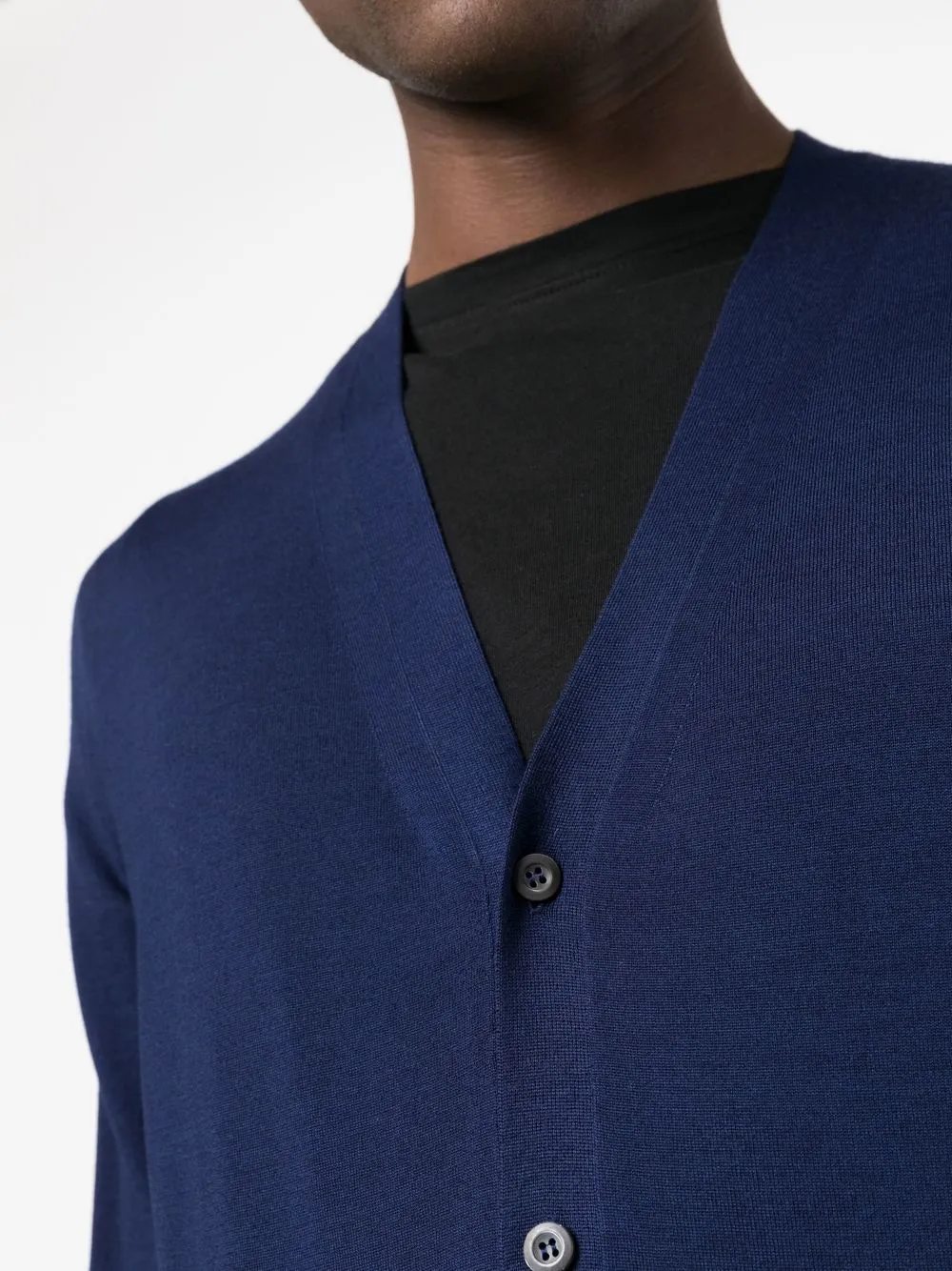 Темно-синий, необработанная шерсть, тонкая вязка, отделка в рубчик, V-образный вырез, застежка на пуговицах спереди, длинные рукава и прямой подол.