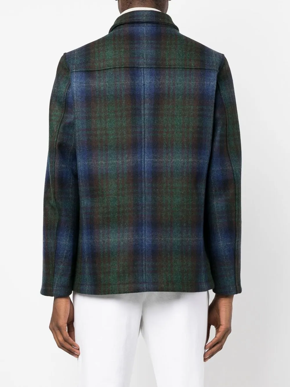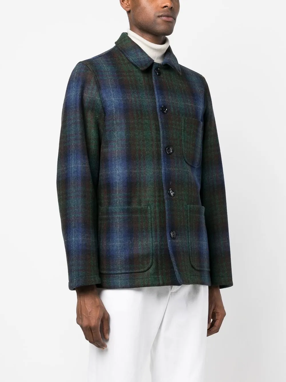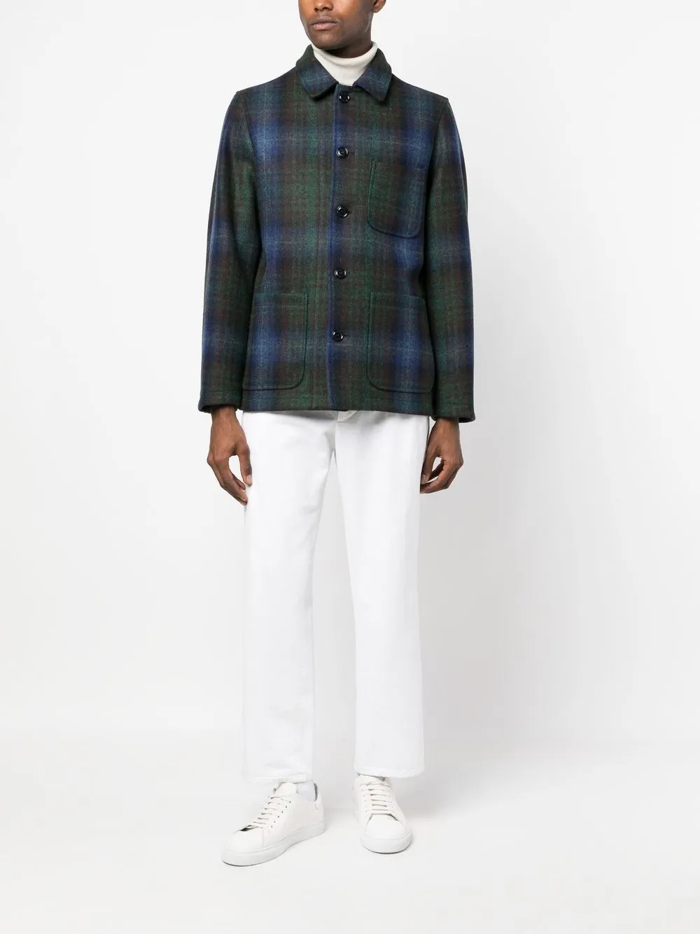 Зеленовато-голубой, разноцветный, необработанная шерсть, клетчатый узор, зазубренные лацканы, застежка на пуговицах спереди, нашивка с логотипом на груди, длинные рукава и два накладных кармана спереди.