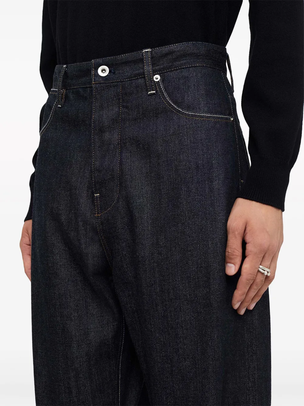 Синий, хлопок, деним, темный оттенок денима, контрастная строчка, прямой крой, средняя посадка, пять карманов, петли для ремня и потайная застежка на молнии и пуговицах.
