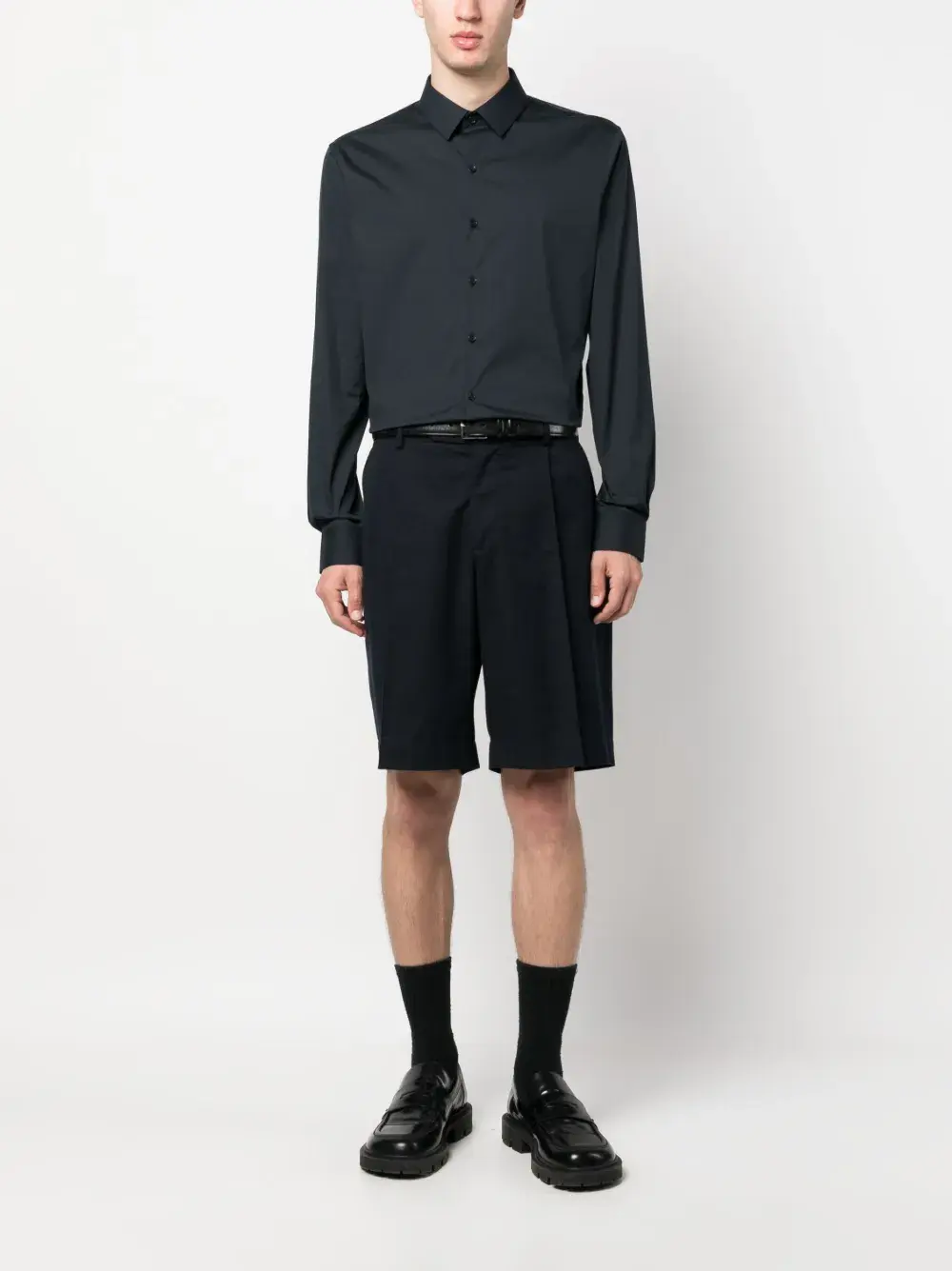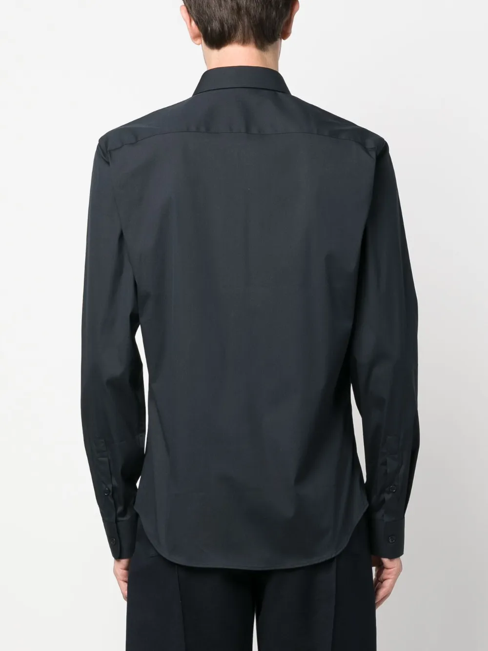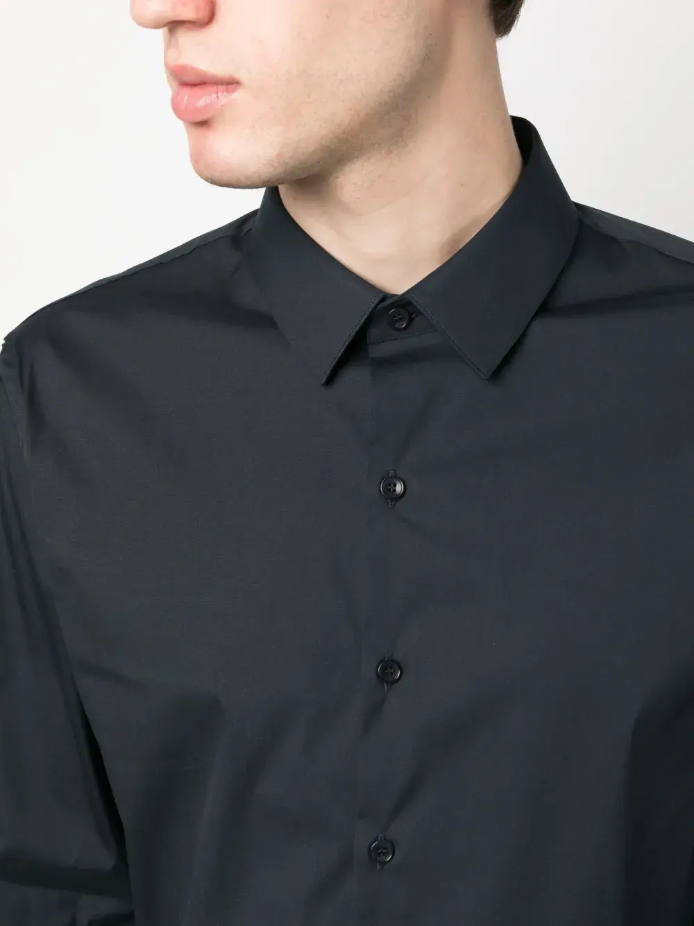 Темно-синий, смесовый хлопок, классический воротник, застежка на пуговицах спереди, длинные рукава, манжеты на пуговицах и закругленный подол.