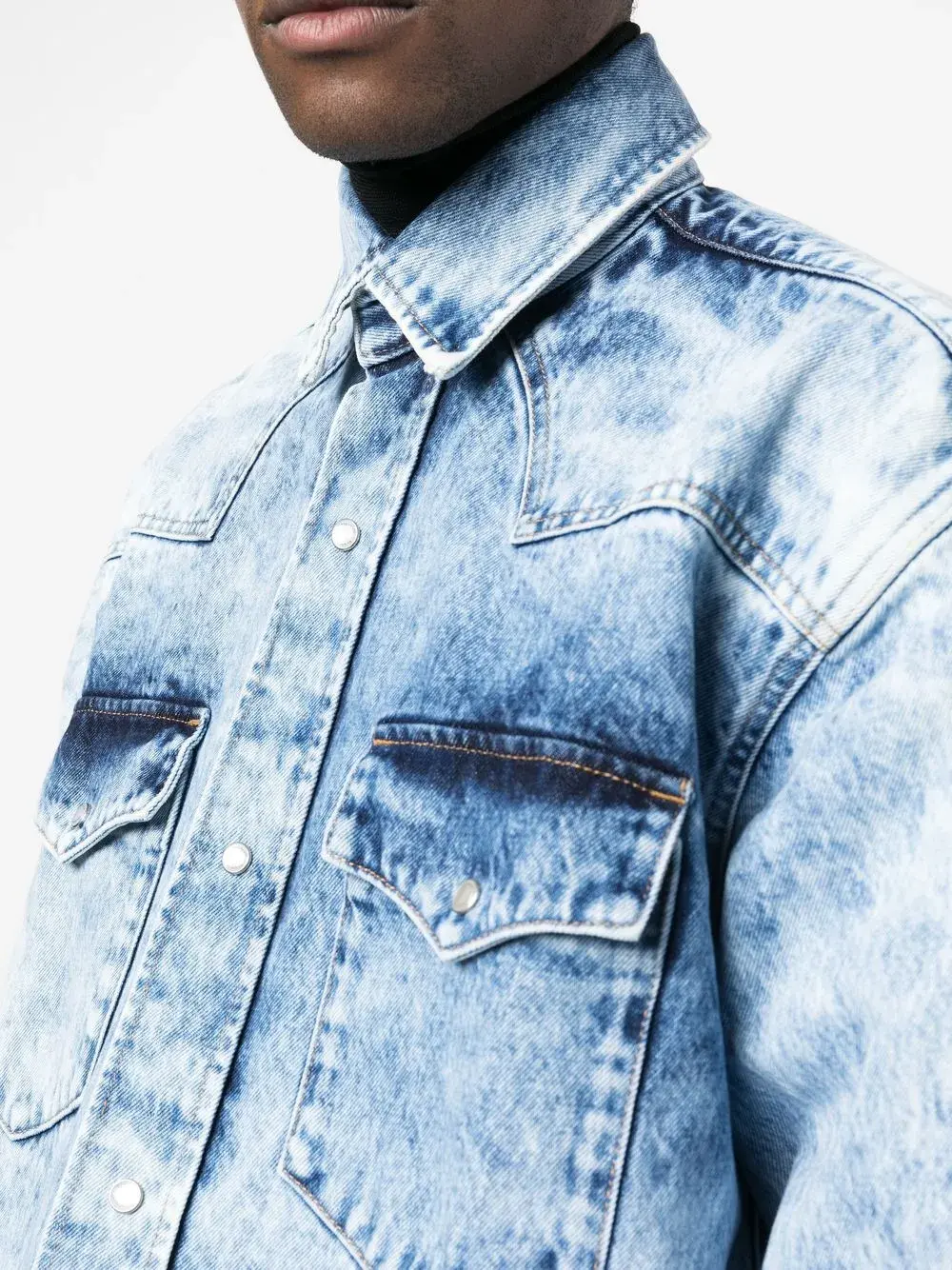 Синий, хлопок, фигурная кокетка, эффект кислотной стирки, классический воротник, два нагрудных кармана с клапанами, планка на пуговицах спереди, длинные рукава, манжеты на пуговицах и закругленный подол.