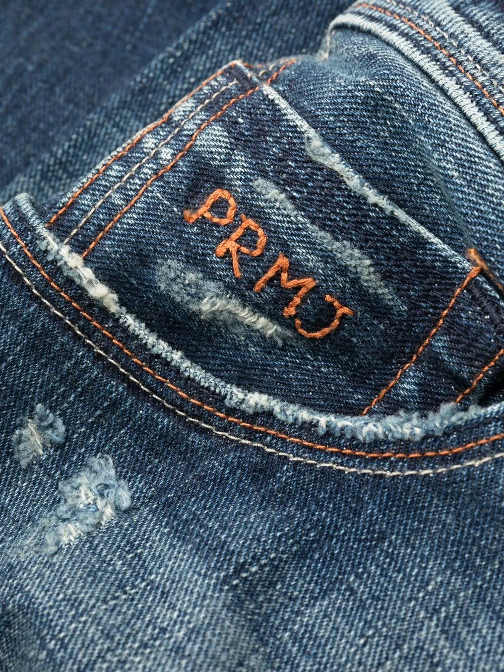 Синий, хлопок, искусственно состаренное покрытие, модель с прорезями, вышитый логотип спереди, вставки в технике пэчворк, средняя посадка, петли для ремня, застежка на молнии и пуговице спереди, пять карманов и зауженный крой.