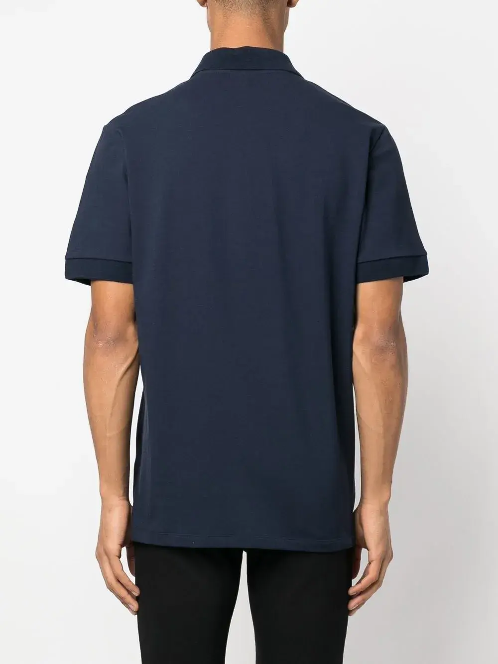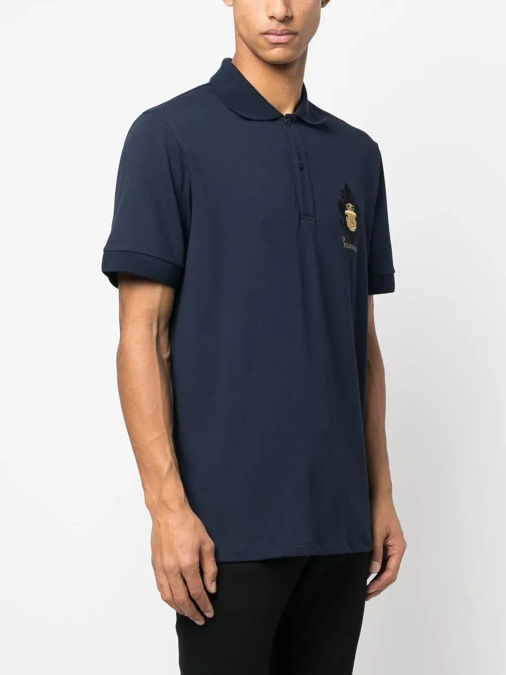 Темно-синий, эластичный хлопок, вышитый логотип на груди, люрекс, воротник поло, планка на пуговицах спереди, короткие рукава и прямой подол.