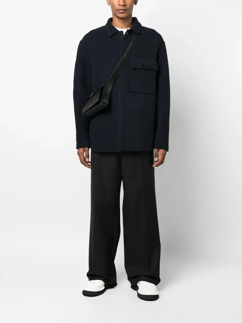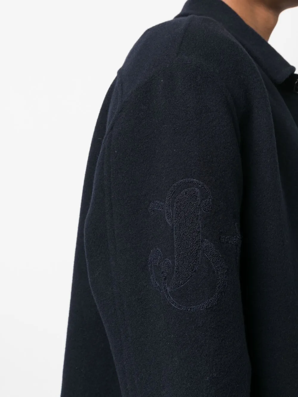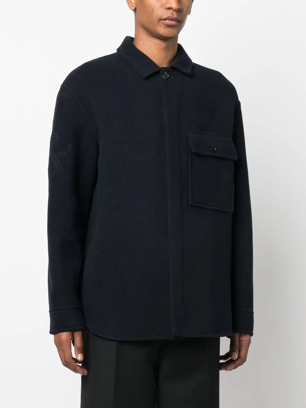 Темно-синий, необработанная шерсть, подкладка из хлопка, эффект войлока, вышитый логотип на рукаве, плоский заостренный воротник, потайная пуговичная застежка спереди, приспущенные плечи, длинные рукава, манжеты на пуговицах, закругленный подол и нагрудный карман с клапаном.