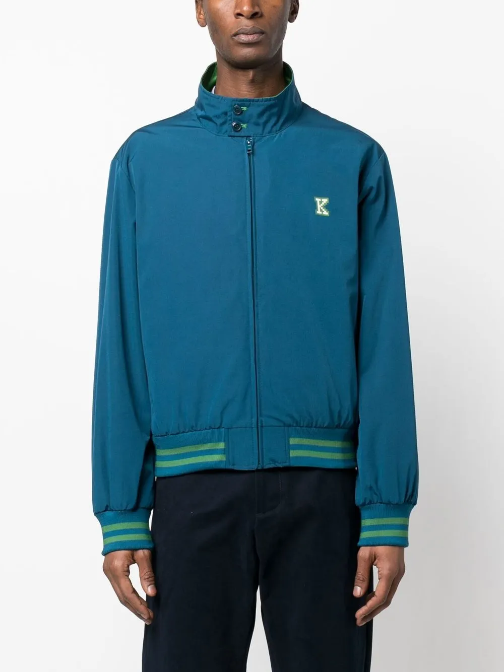 Сине-зеленый, принт с логотипом сзади, отделка в полоску, застежка на молнии спереди, эластичные манжеты и контрастный пояс.