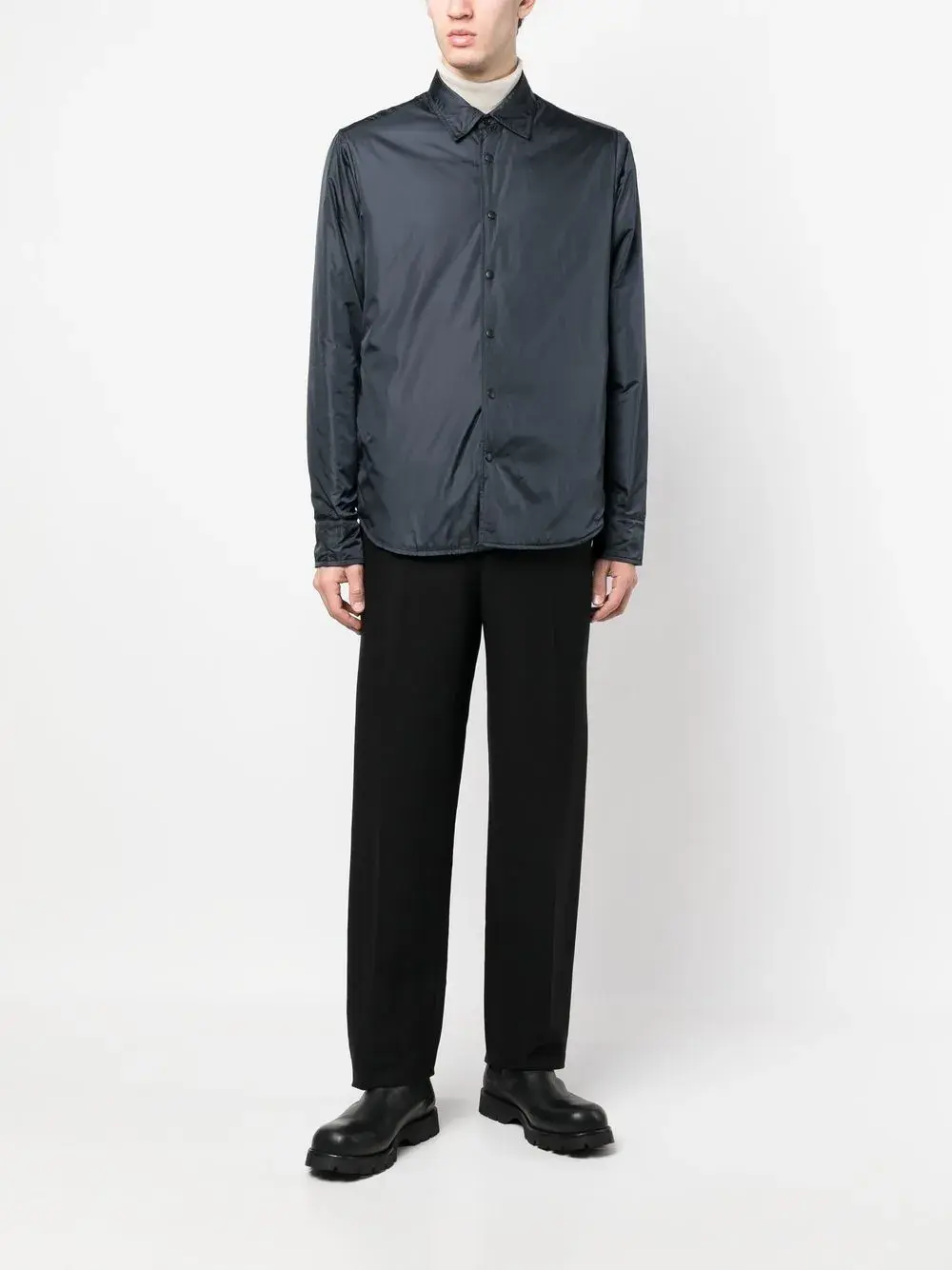 Темно-синий, классический воротник, застежка на кнопках спереди, длинные рукава, манжеты с застежкой на кнопки и закругленный подол.