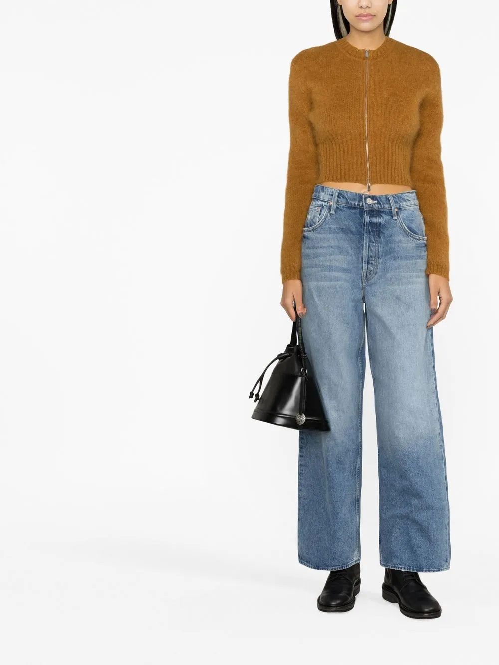 Голубой, хлопок, эффект потертости, нашивка с логотипом сзади, завышенная талия, ширинка на пуговицах, пять карманов и широкий крой. . Узнать больше о том, какие товары получают отметку «Ответственный выбор», можно из материала «Как мы оцениваем экологичность и этичность».