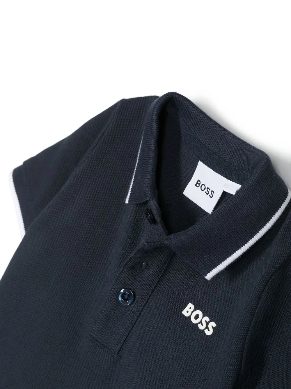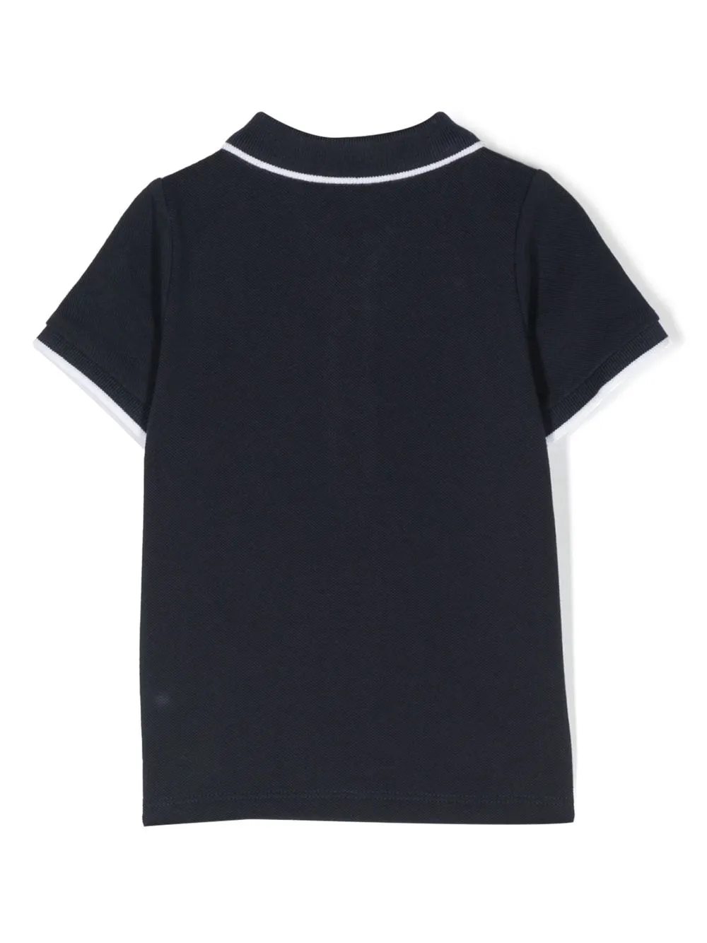 Темно-синий, хлопок, ткань пике, принт с логотипом на груди, контрастная отделка, воротник поло, короткие рукава и прямой подол.