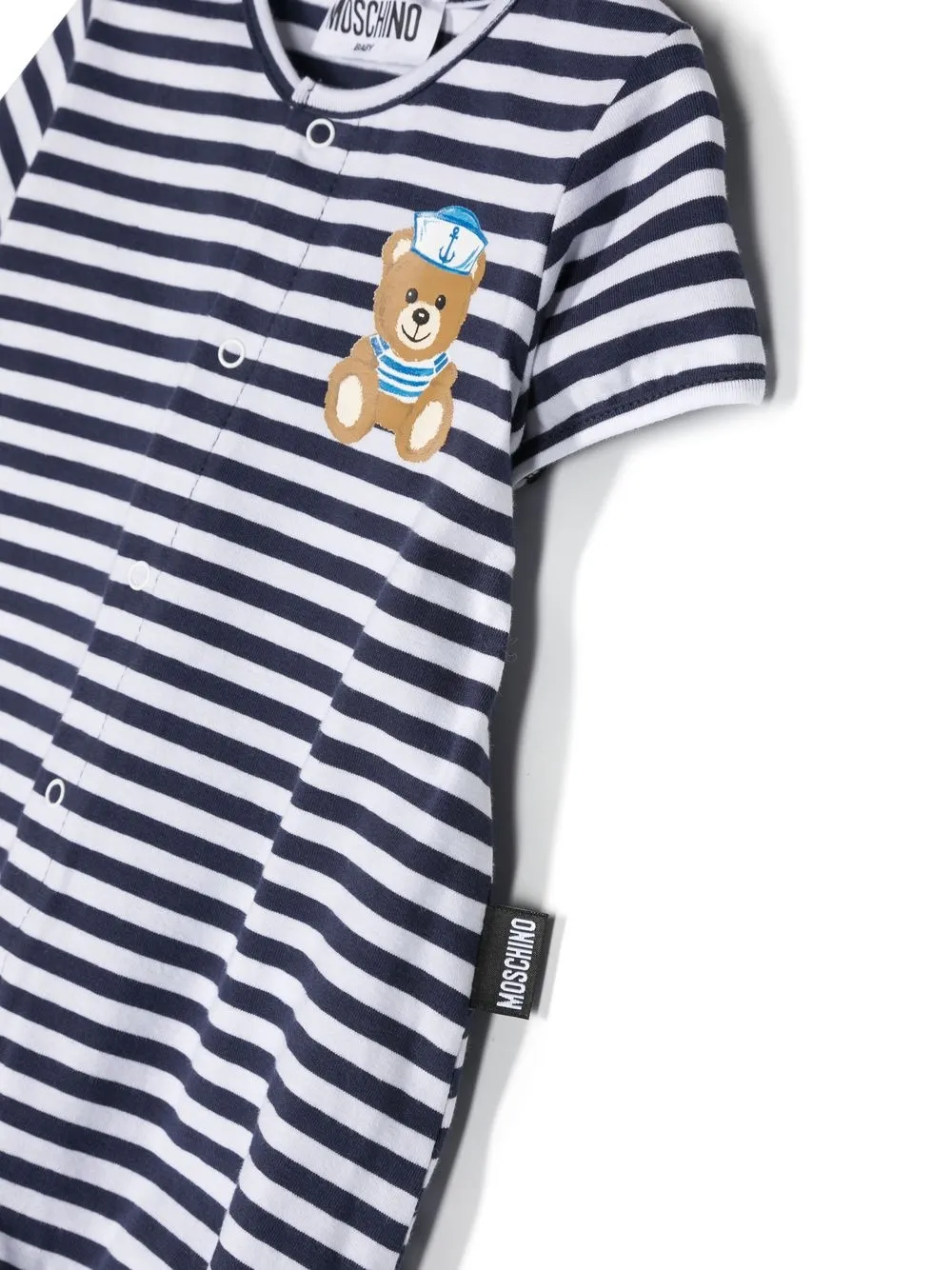 Синий/белый, эластичный хлопок, узор в горизонтальную полоску, принт с изображением плюшевого медведя, круглый вырез, застежка на пуговицах спереди и короткие рукава.