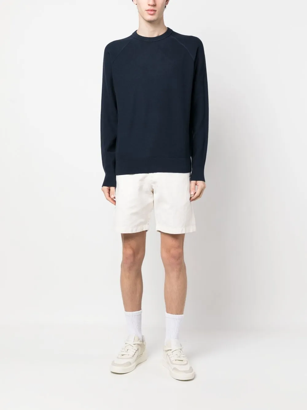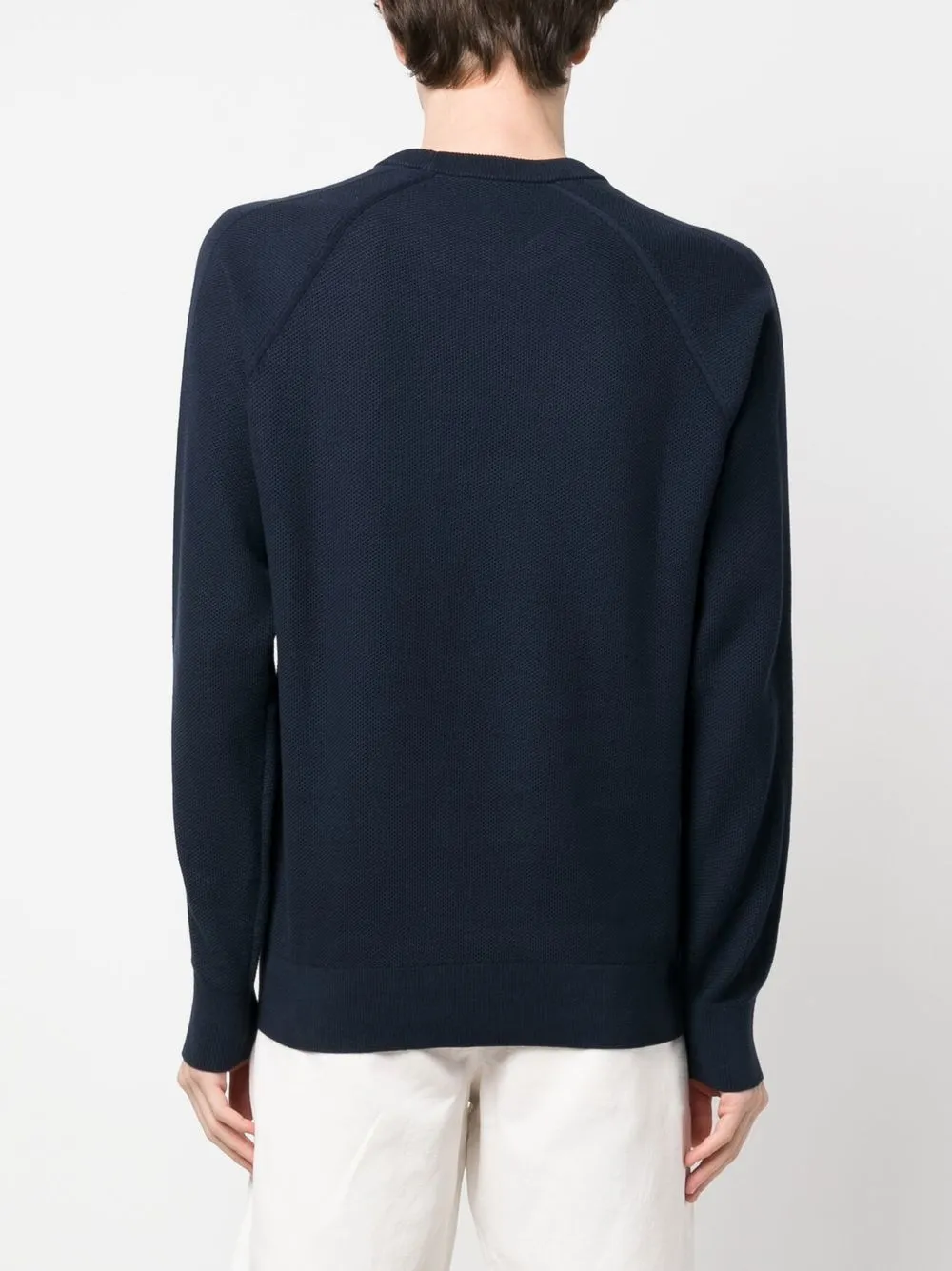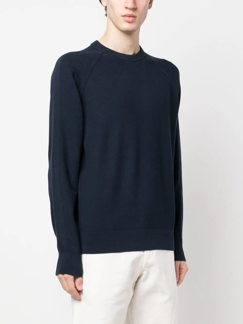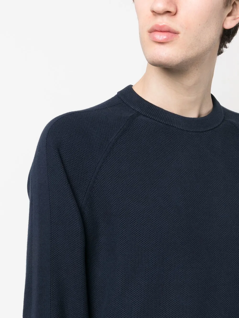 Темно-синий, хлопок, ажурная вязка, круглый вырез, длинные рукава реглан, манжеты в рубчик и подол в рубчик.