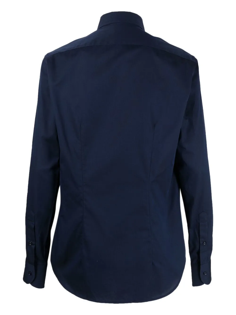 Темно-синий, хлопок, классический воротник, застежка на пуговицах спереди, длинные рукава, манжеты на пуговицах и закругленный подол.