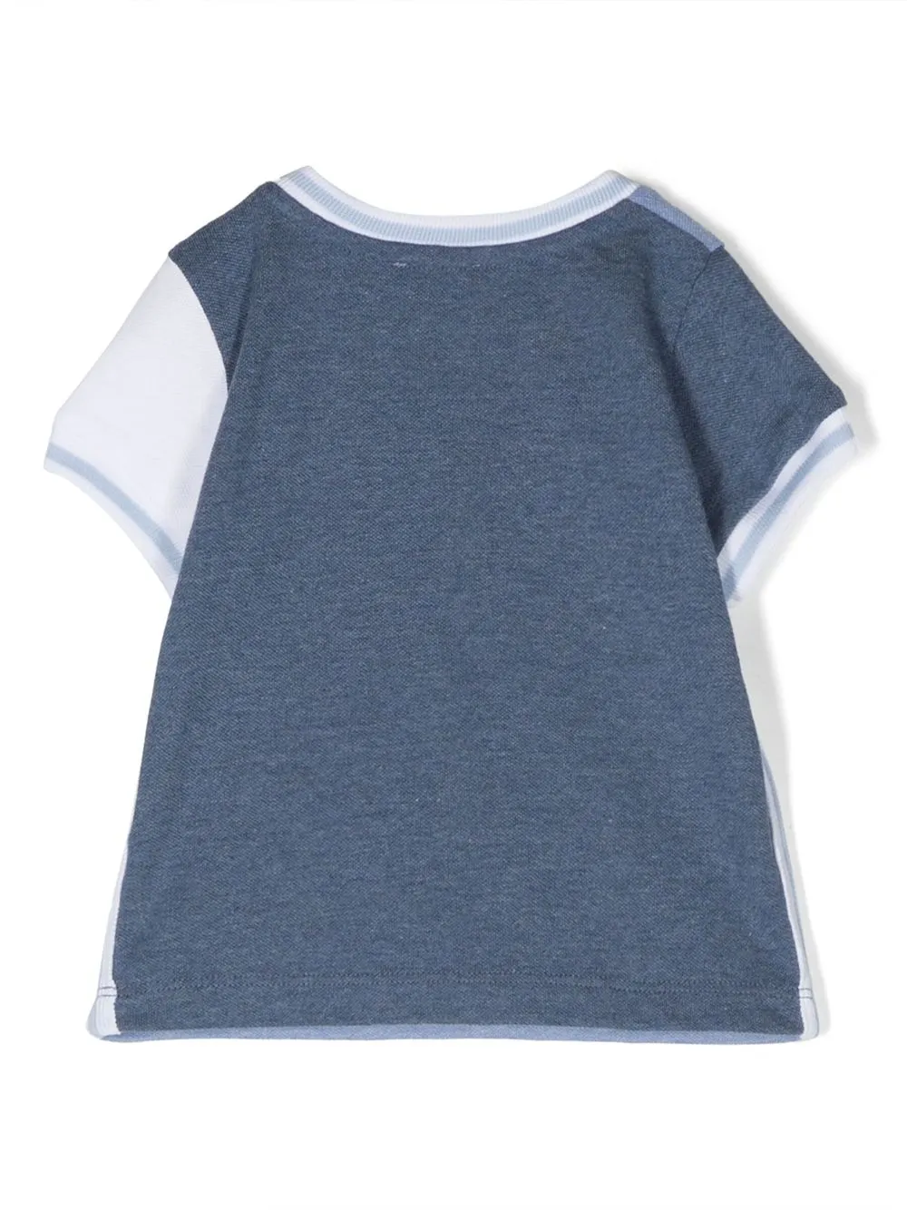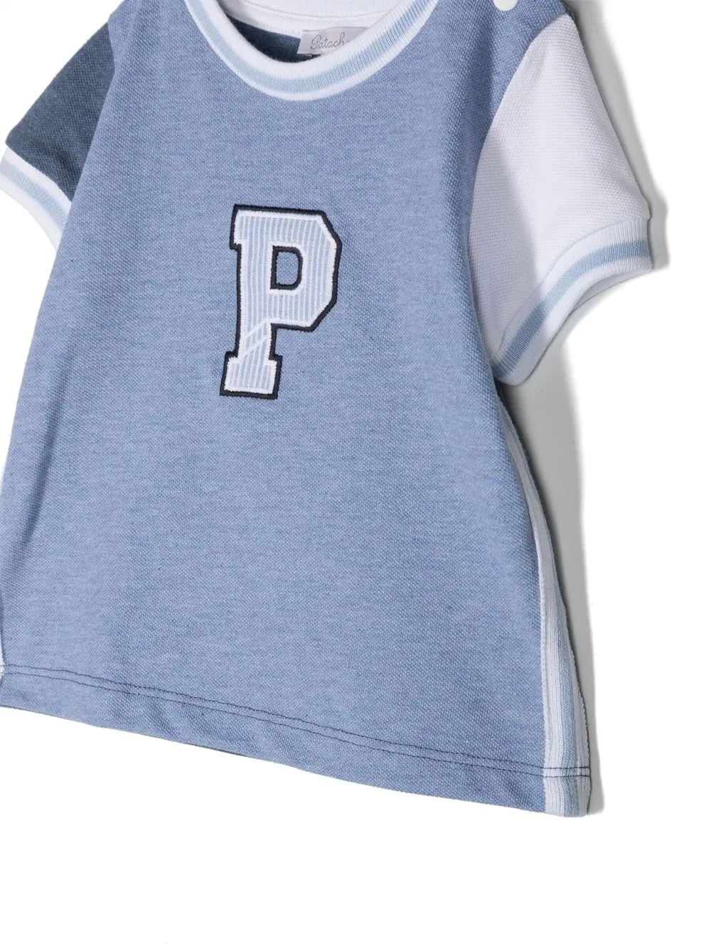 Хлопок, вставки, нашивки в виде букв, полоски, круглый вырез, пуговичные застежки на плечах, короткие рукава и прямой подол.
