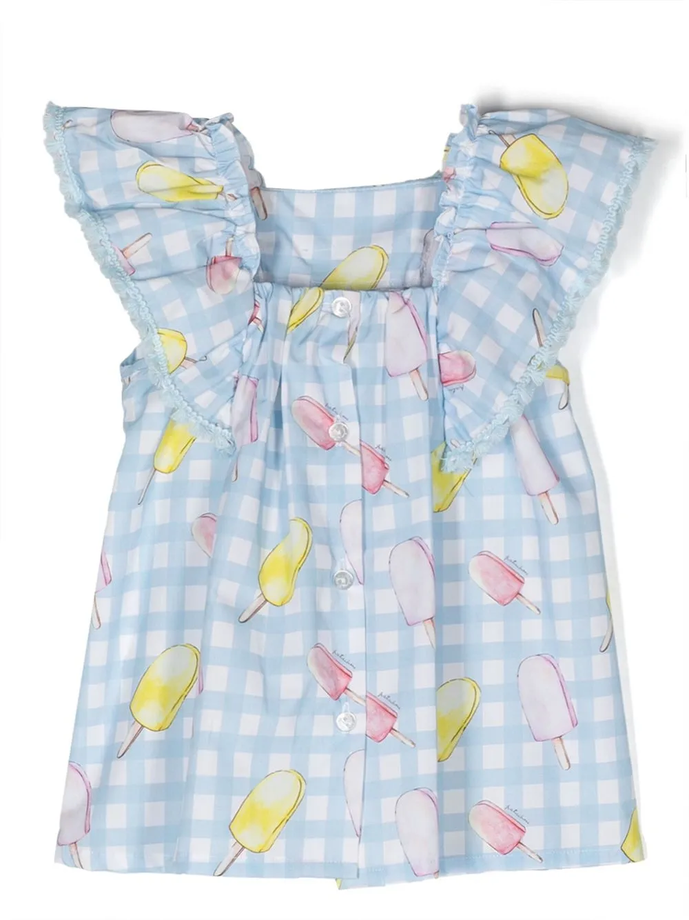 Принт в клетку, сплошной графичный принт, вставки с оборками, золотистый металлический логотип, квадратный вырез, без рукавов и прямой подол.