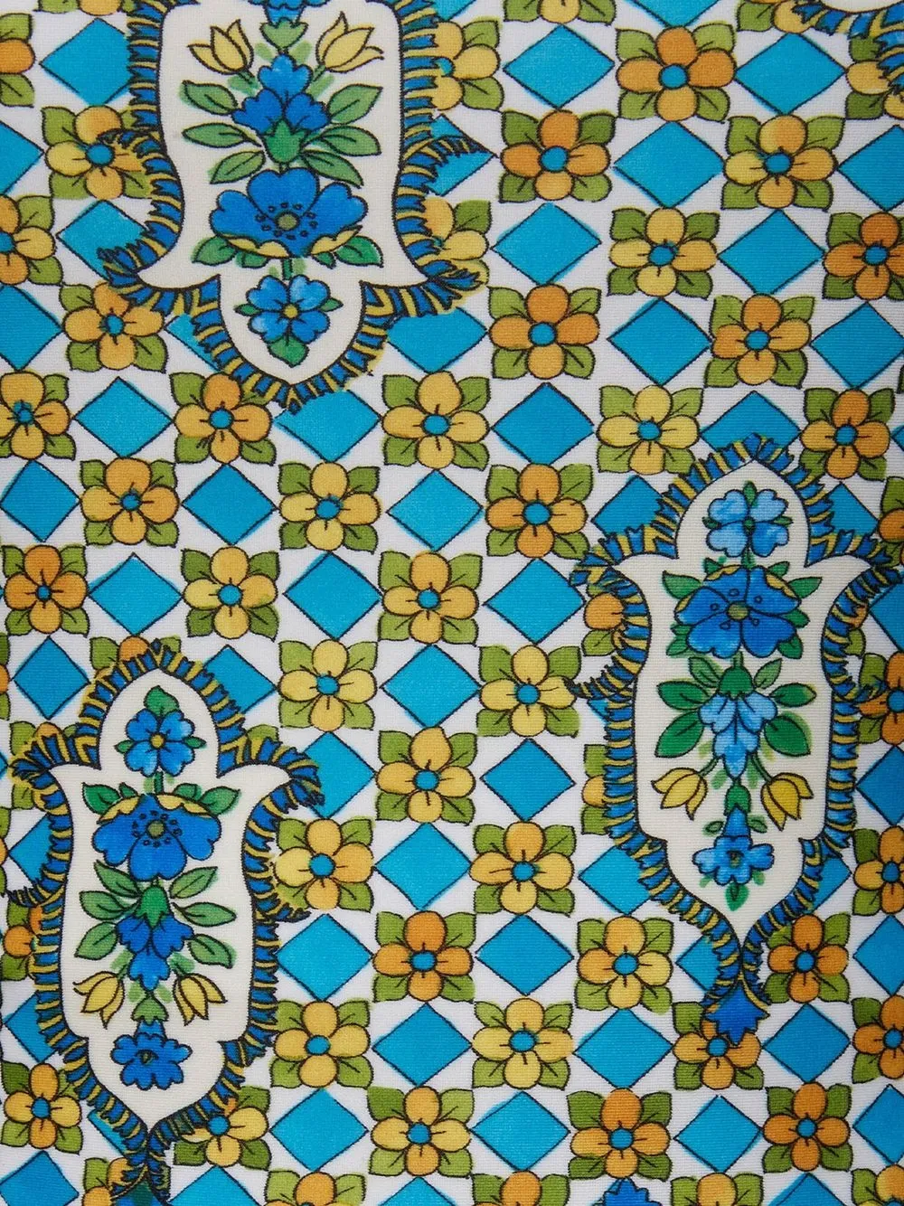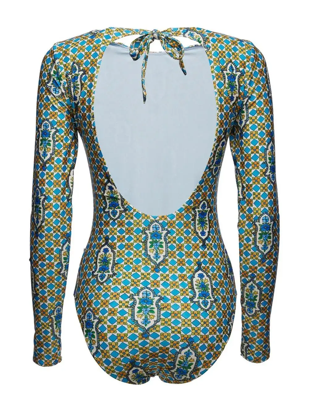 Бирюзовый, сплошной графичный принт, круглый вырез, застежка на завязке сзади и длинные рукава. Пожалуйста, примеряйте купальники и пляжные шорты только поверх собственного белья.