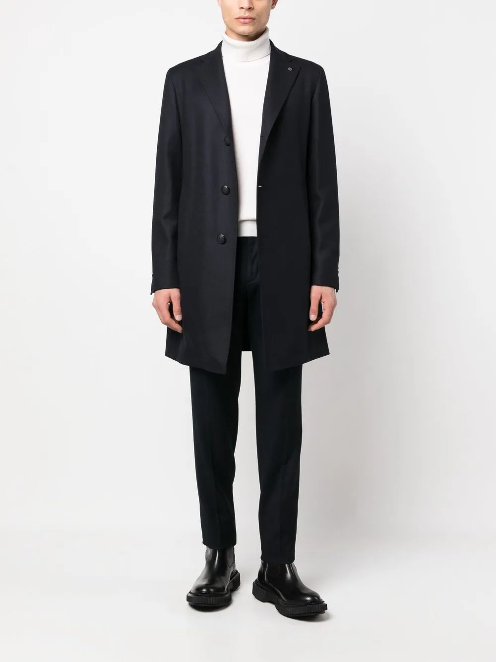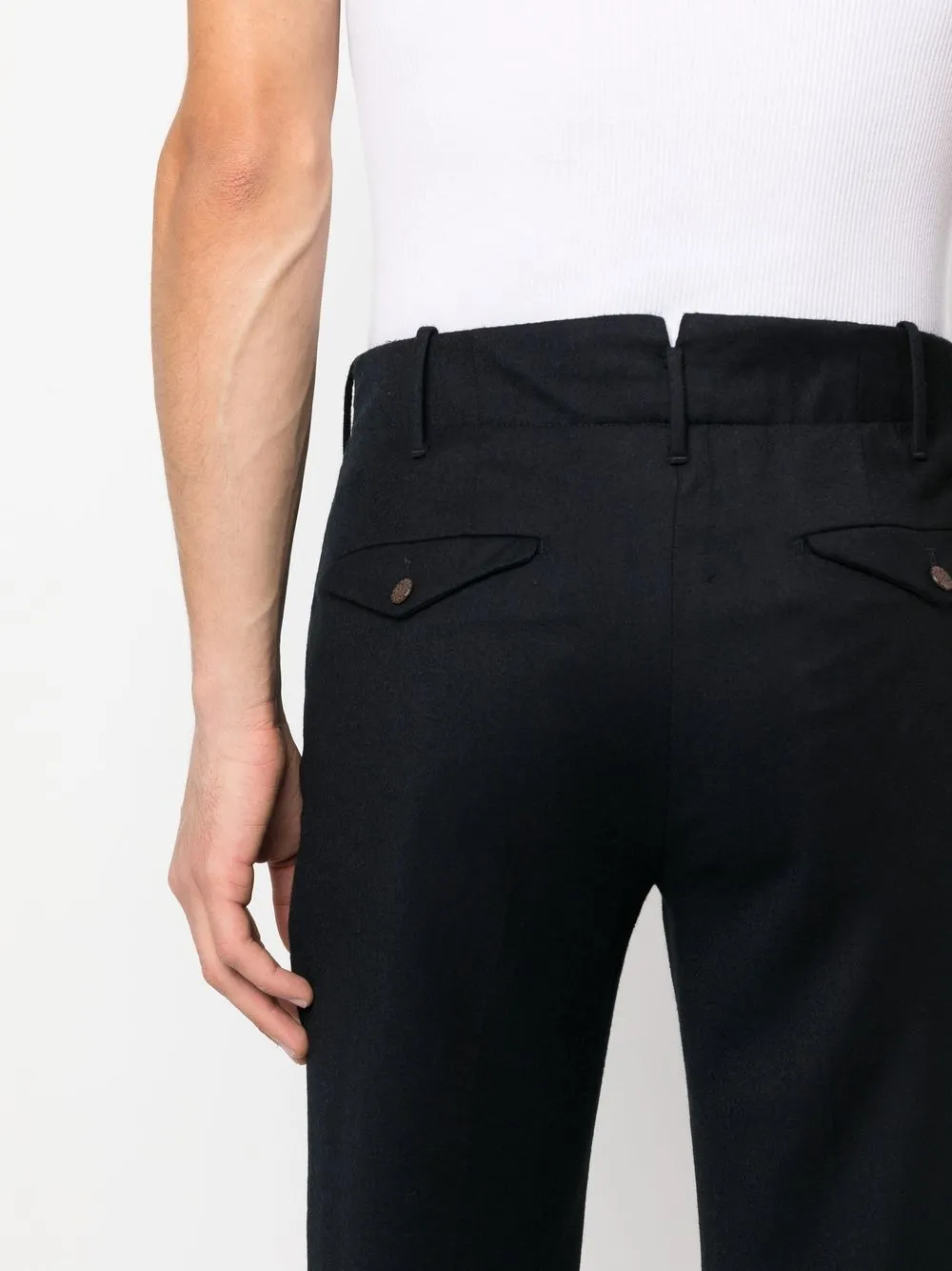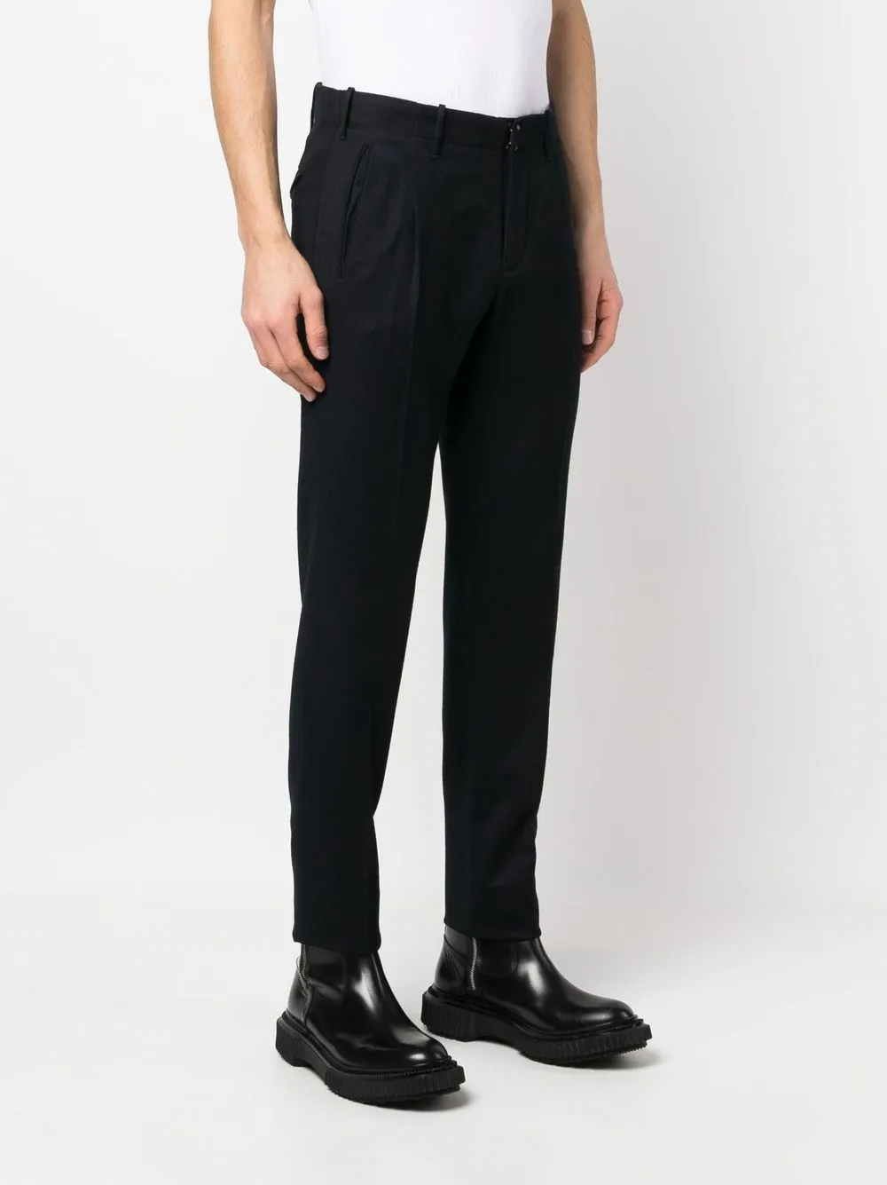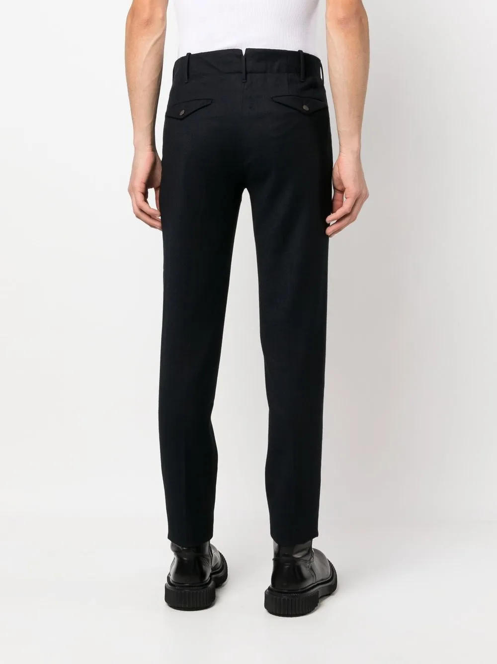 Темно-синий, смесовая необработанная шерсть, петли для ремня, застежка на молнии и пуговице спереди, два прорезных кармана по бокам, два кармана с клапанами сзади и зауженный крой.