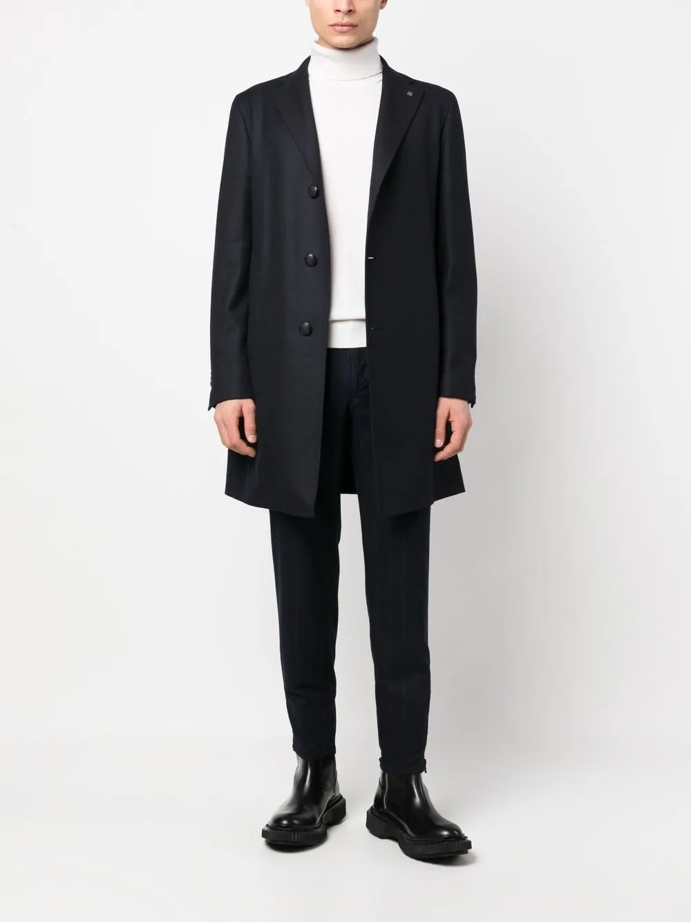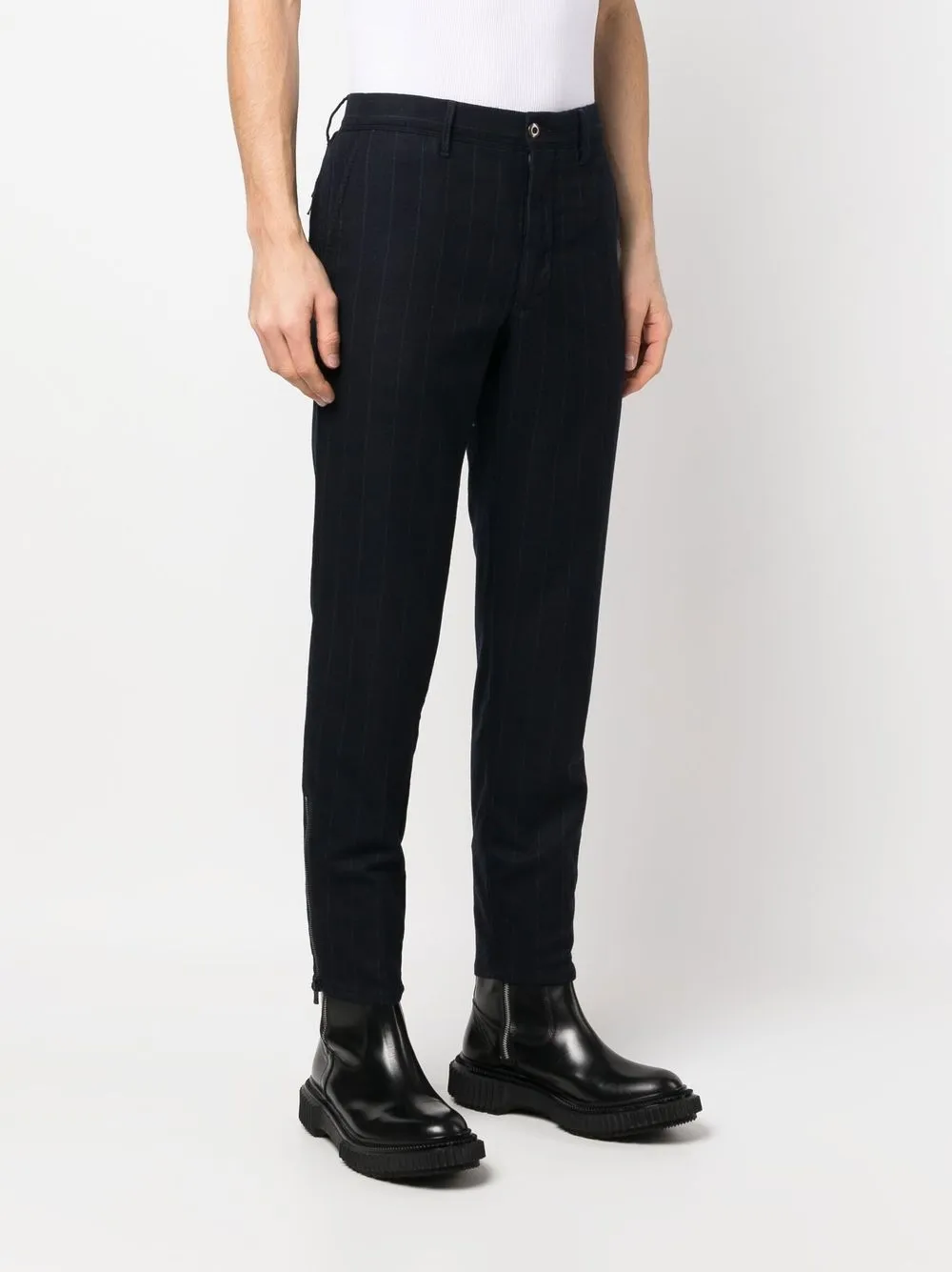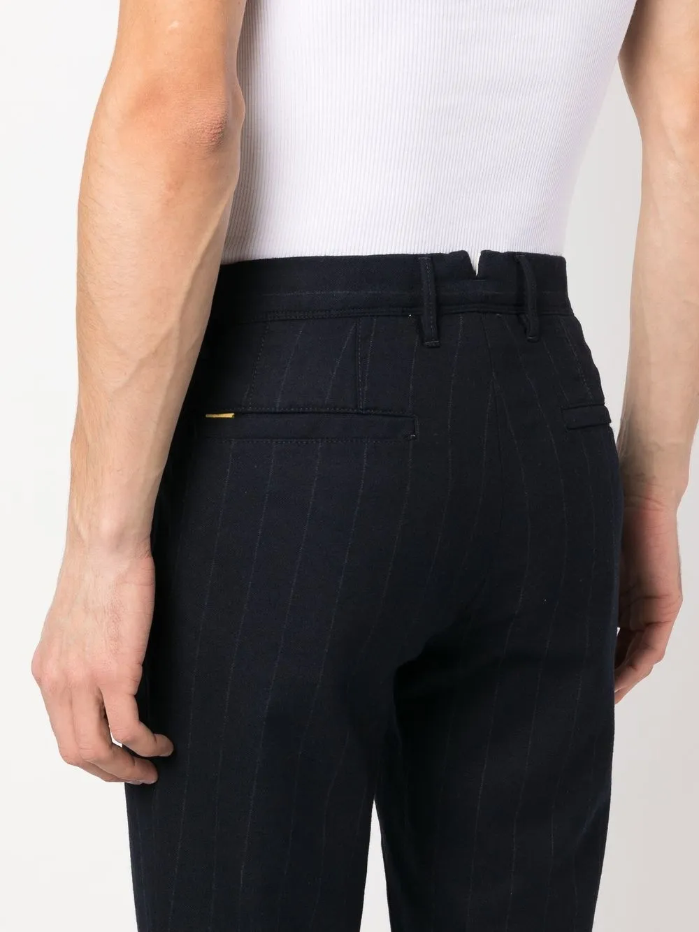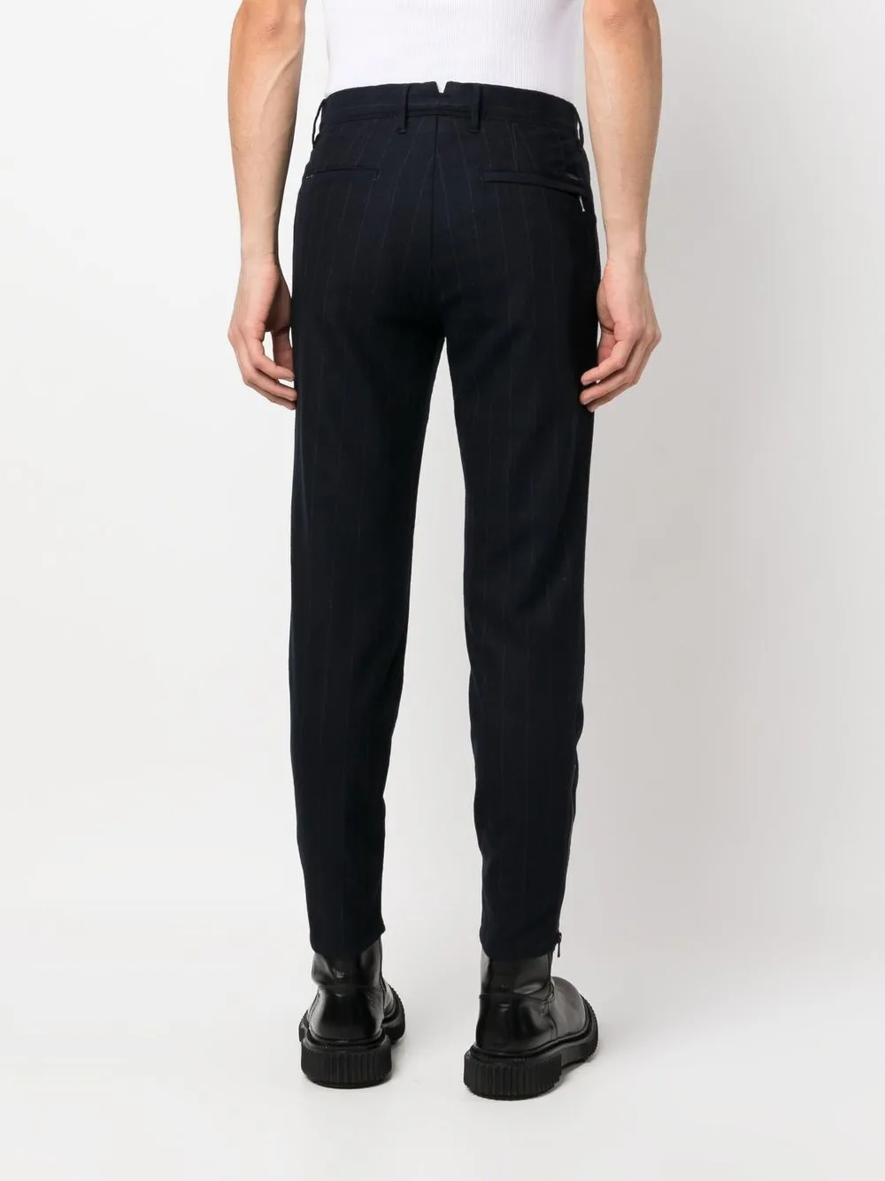 Темно-синий, смесовая необработанная шерсть, узор в тонкую полоску, петли для ремня, застежка на молнии и пуговице спереди, два прорезных кармана по бокам, два кармана с листочкой сзади и прямой крой.