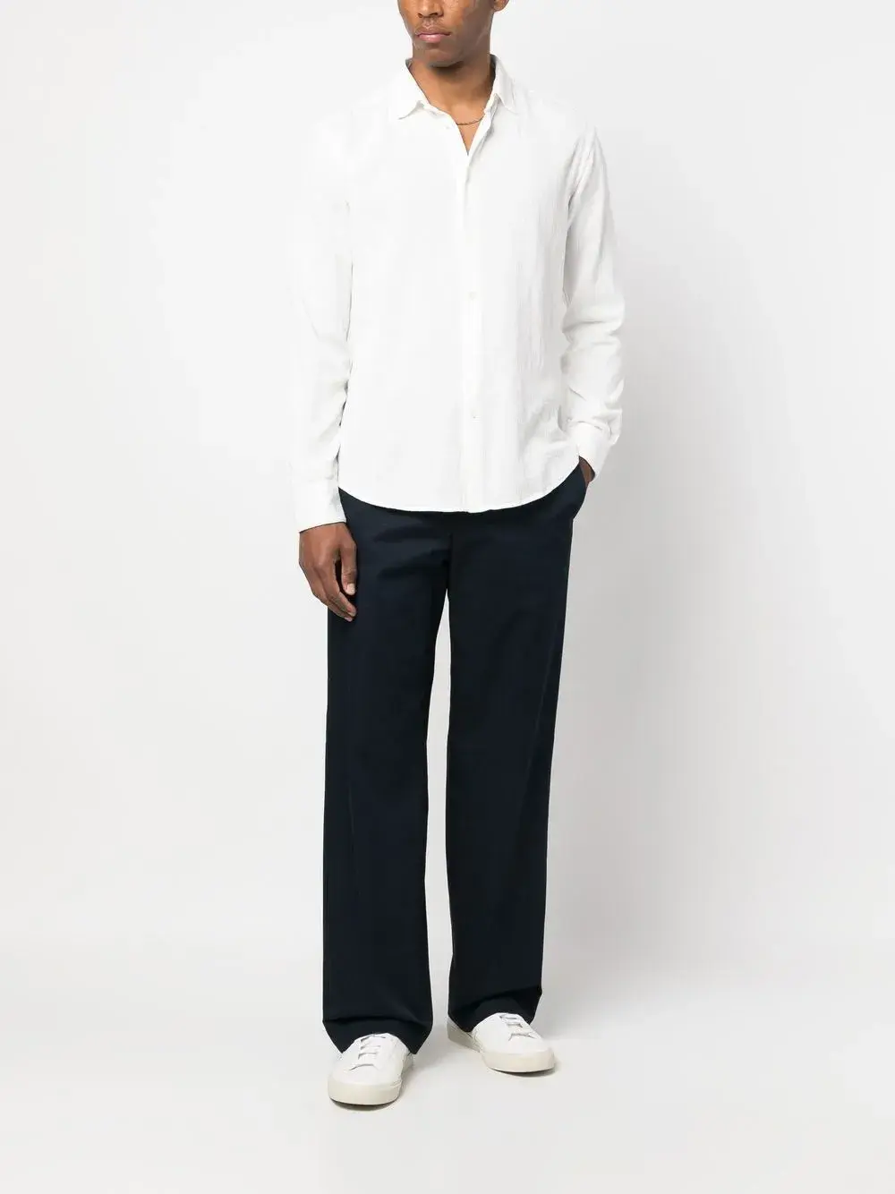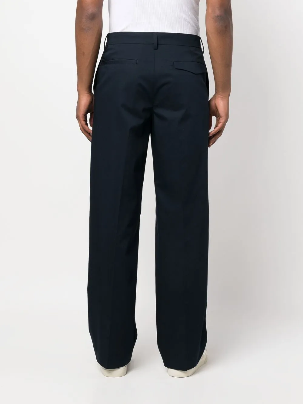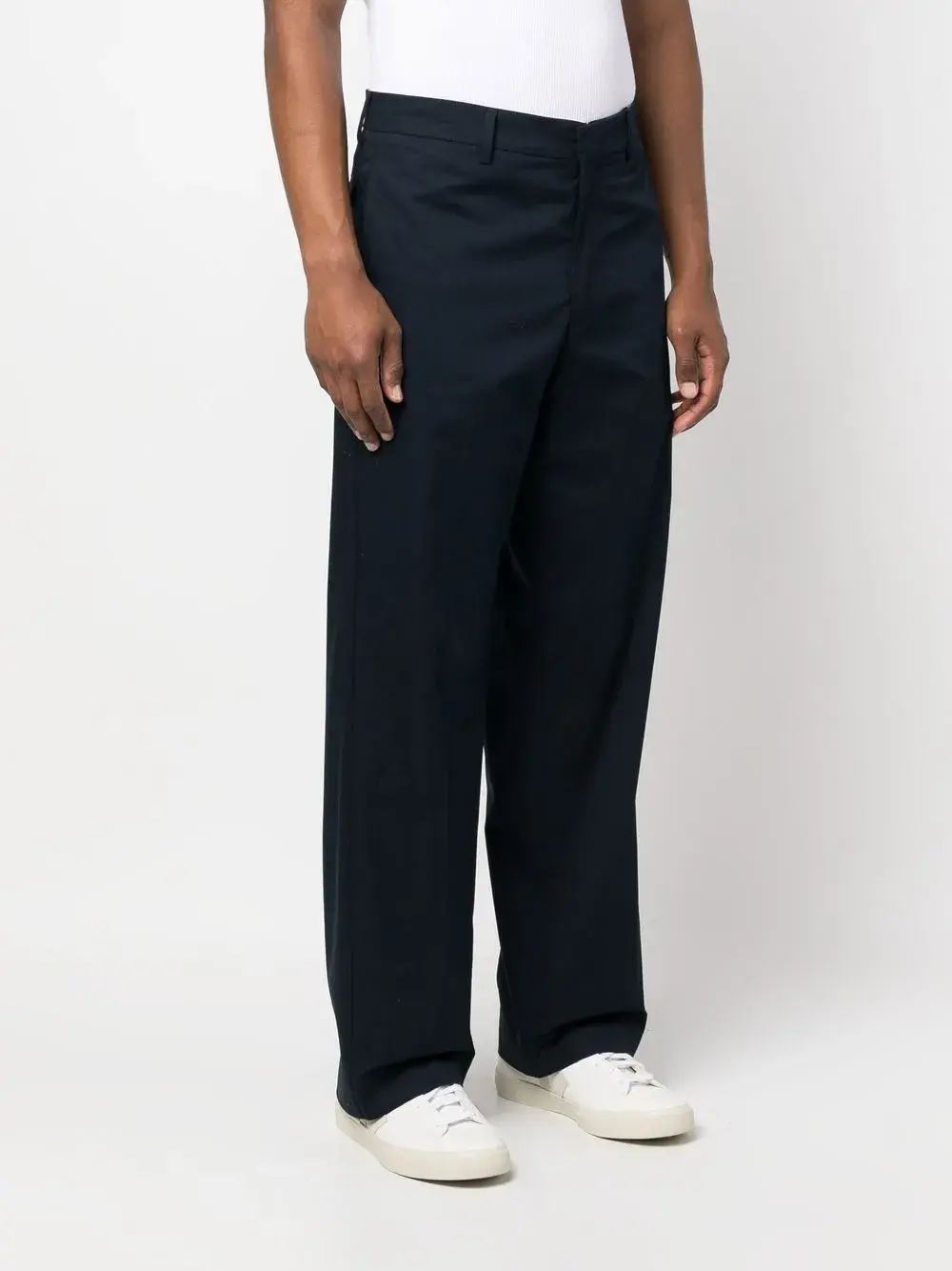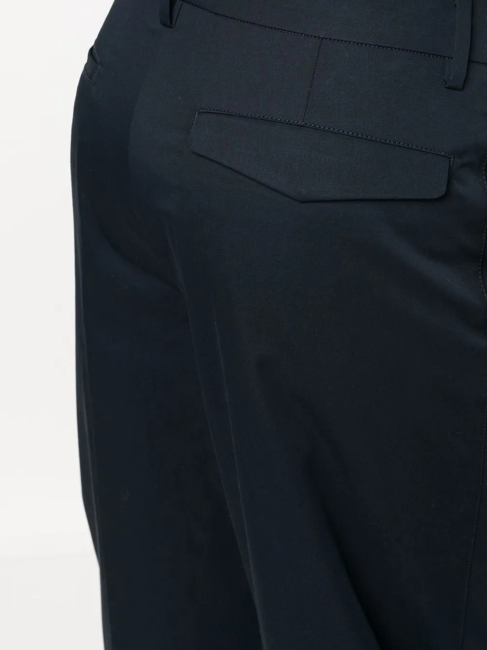 Темно-синий, хлопок, петли для ремня, потайная молния спереди, два прорезных кармана по бокам, два кармана с листочкой сзади и прямой крой.