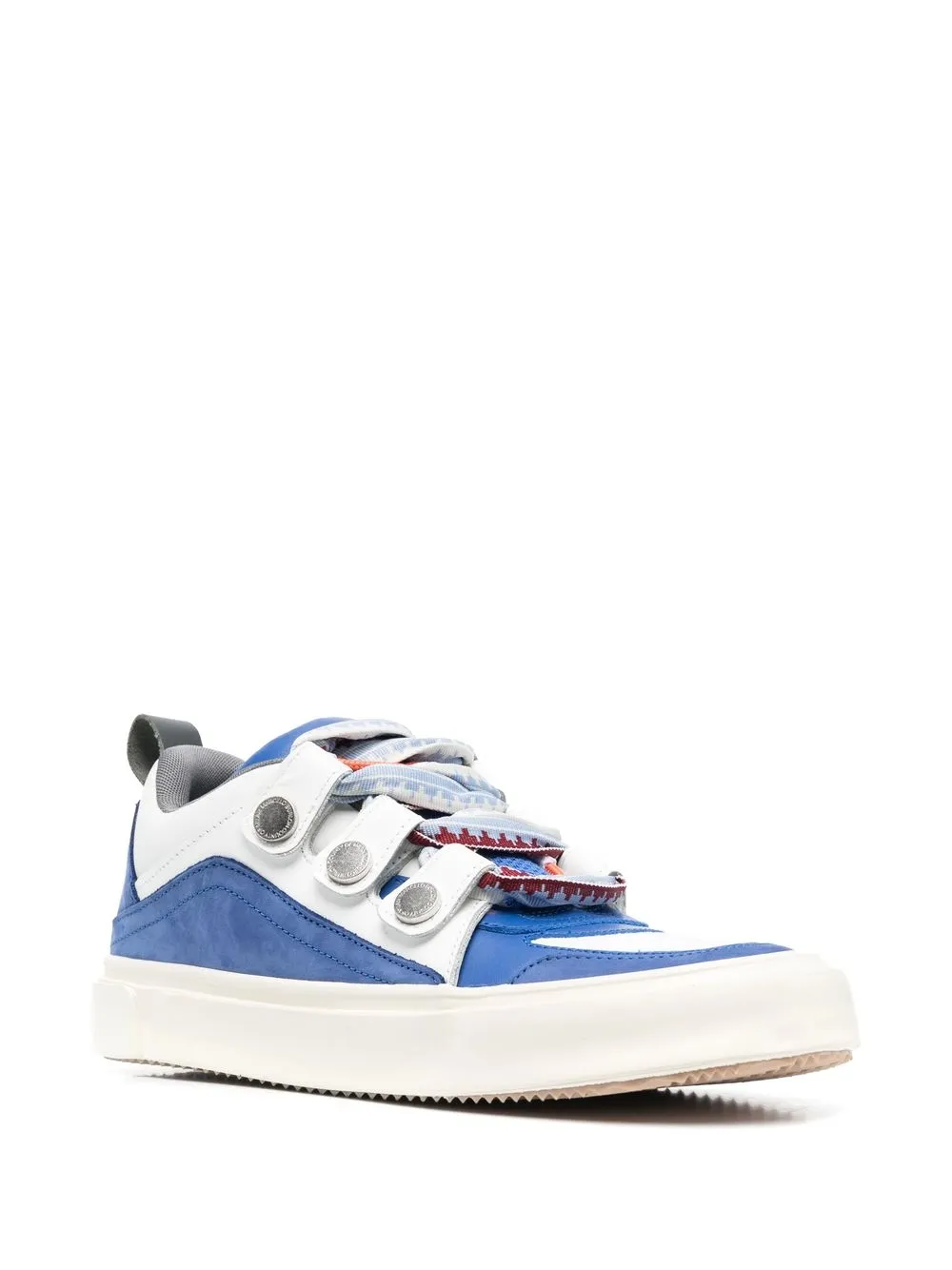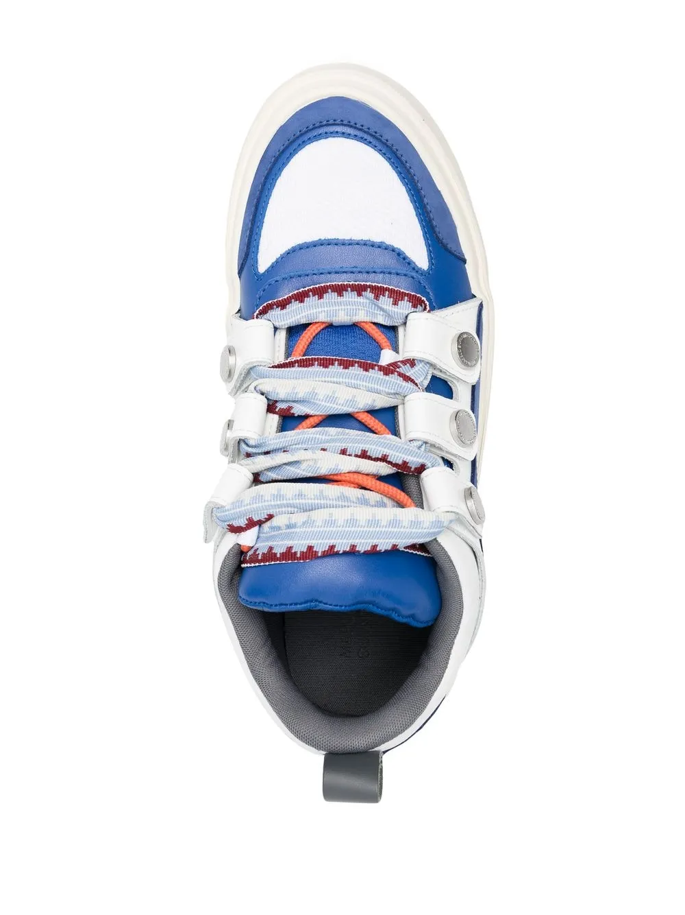 Кобальтово-синий, белый, телячья кожа, смесовый хлопок, вставки, закругленный носок, шнуровка спереди, петля для подтягивания сзади и плоская резиновая подошва.