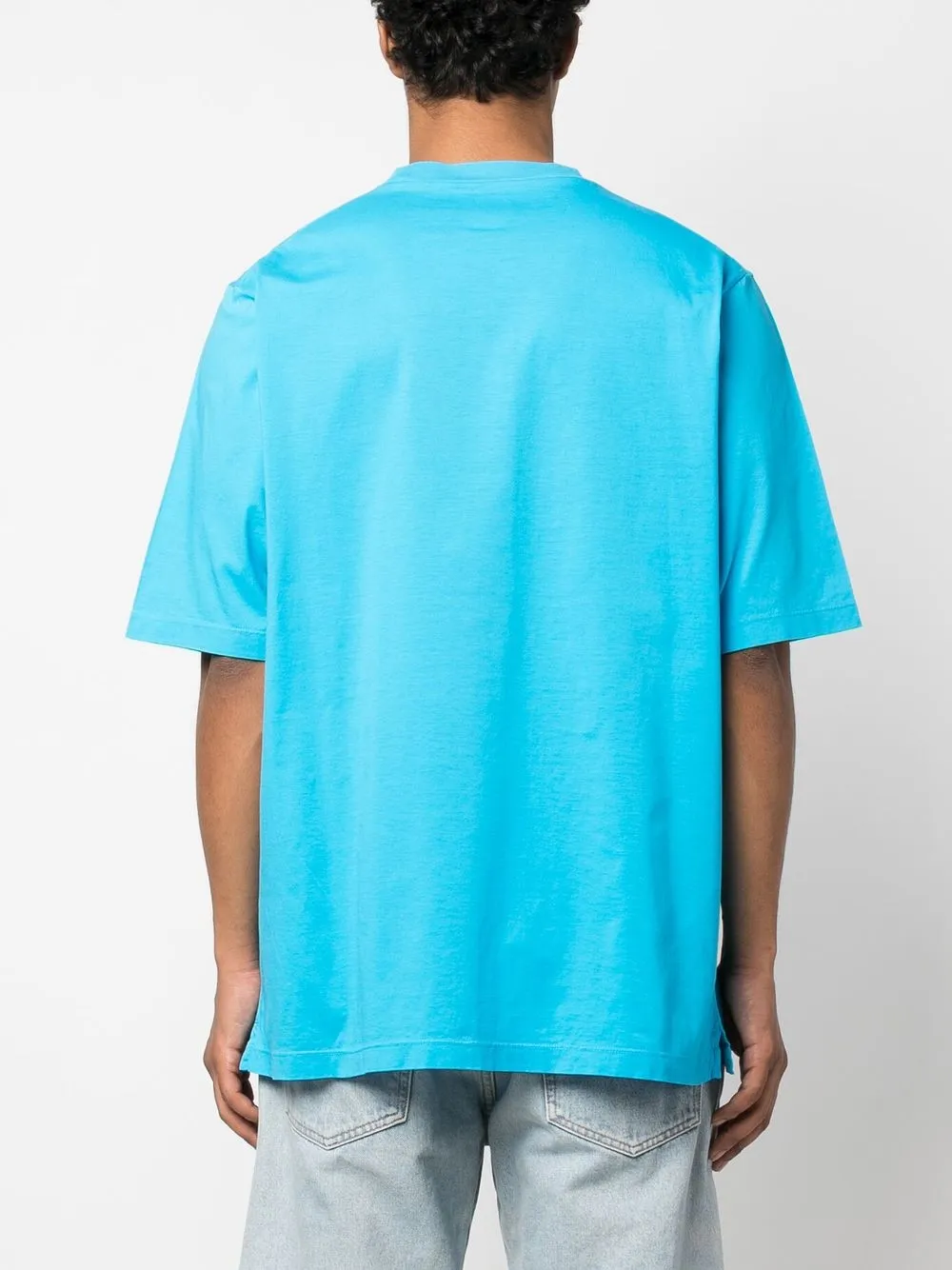 Сине-зеленый, хлопок, ткань джерси, принт с логотипом на груди, круглый вырез, приспущенные плечи, короткие рукава и прямой подол.