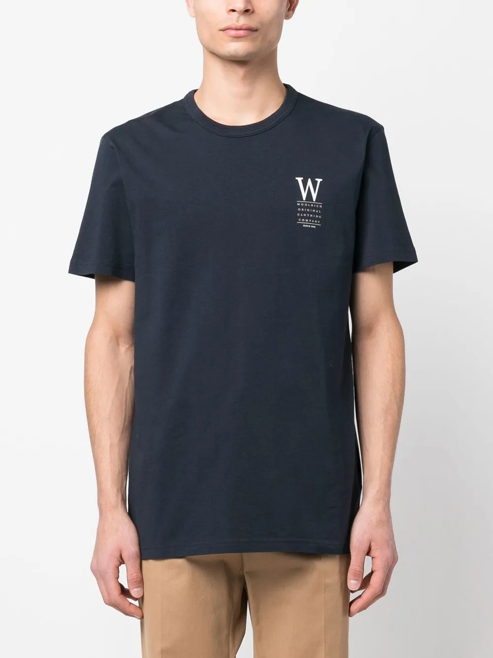 Темно-синий, хлопок, принт с логотипом на груди, принт с логотипом сзади, круглый вырез, короткие рукава и прямой подол.