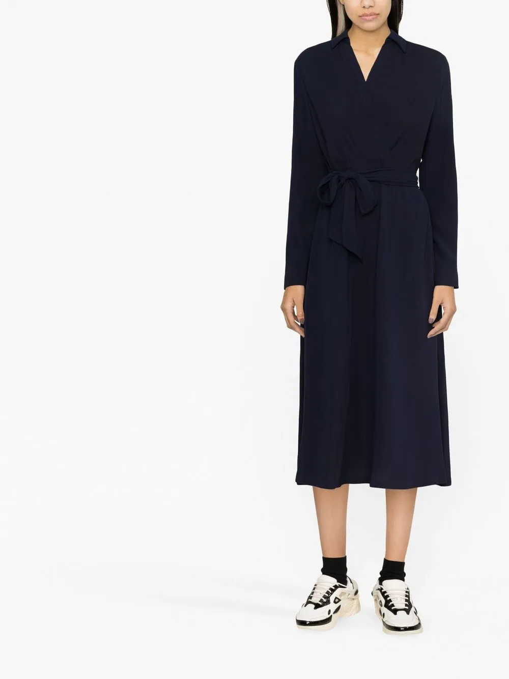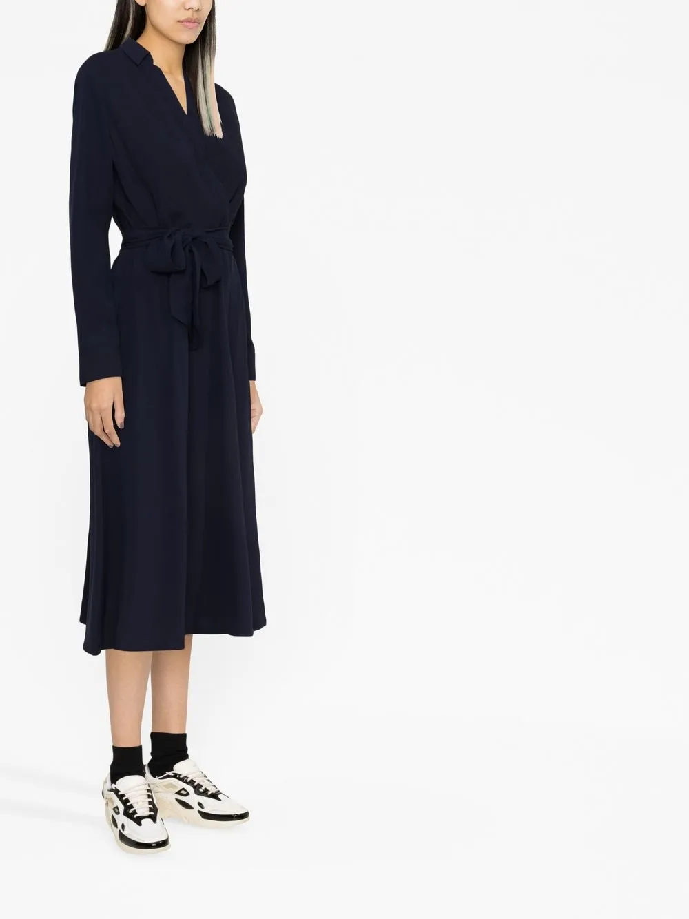 Темно-синий, V-образный вырез, ремень на талии и длинные рукава.