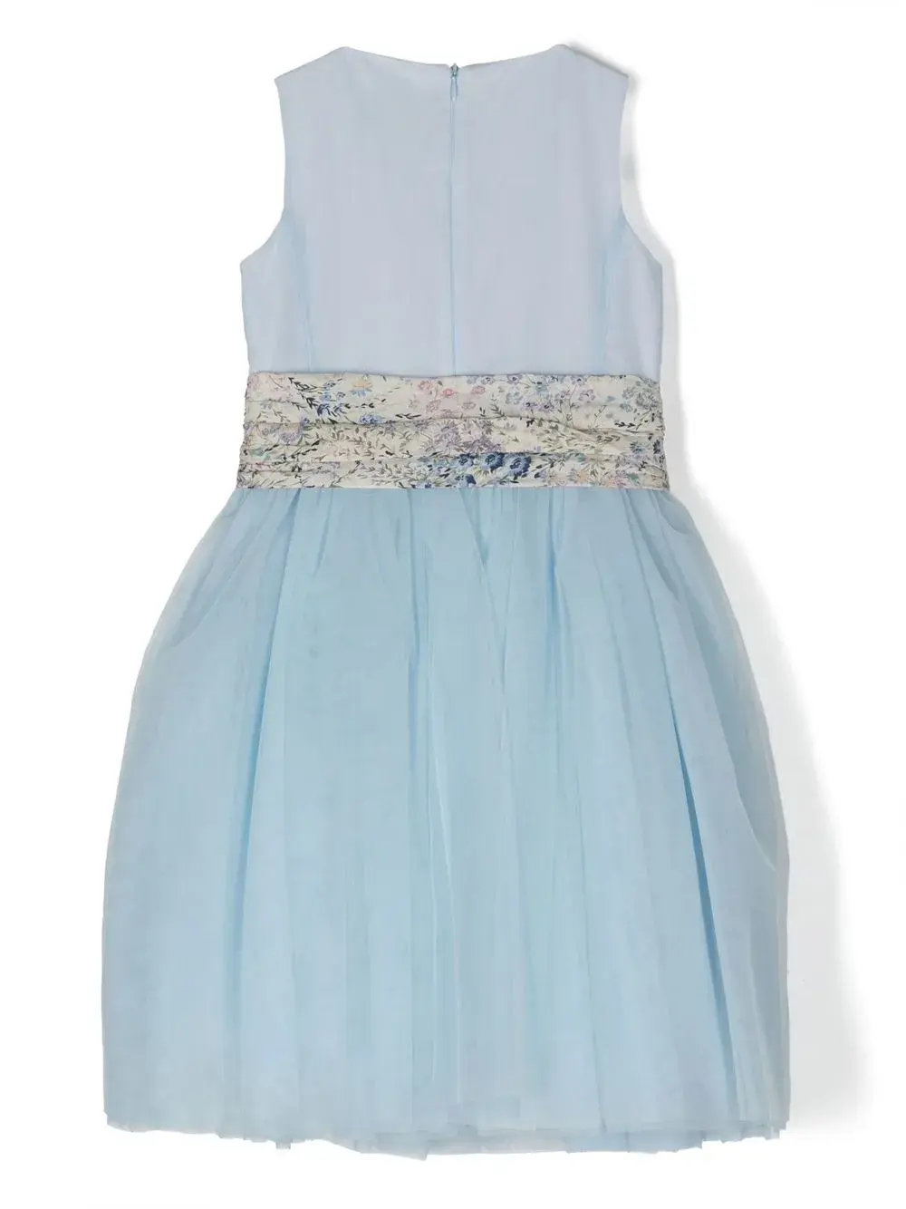 Синий, хлопок, бант, верхний слой из тюля, круглый вырез, потайная застежка на молнии сзади, без рукавов, расклешенный крой, прямой подол и длина миди.