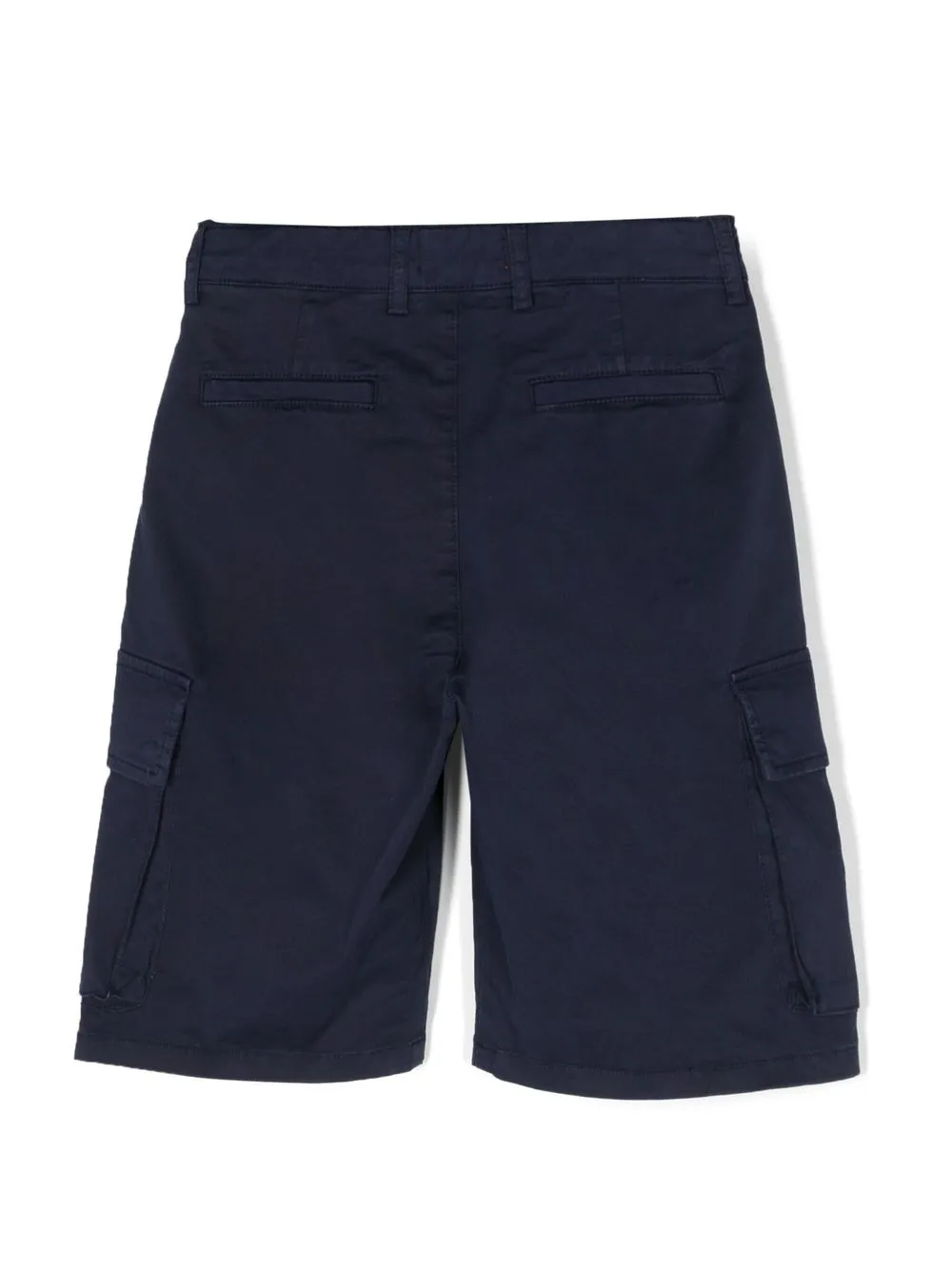 Темно-синий, эластичный хлопок, плетение с узором зигзаг, петли для ремня, потайная застежка на молнии и пуговицах, два кармана по бокам, два кармана с листочкой сзади и два кармана с клапанами по бокам.