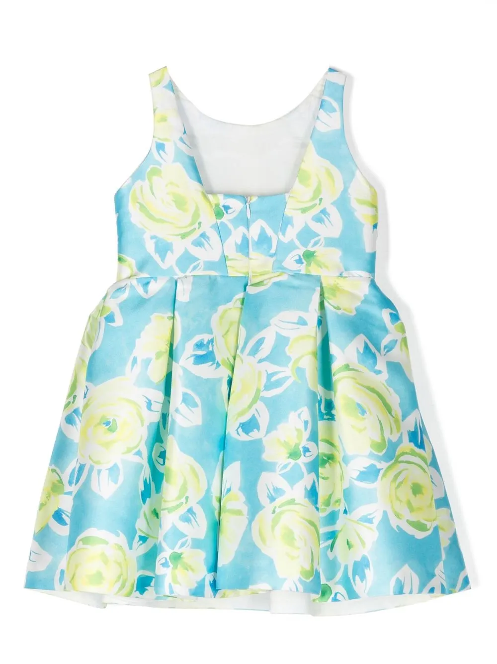 Голубой, ярко-зеленый, белый, смесовый хлопок, сплошной цветочный принт, плиссированная юбка, круглый вырез, потайная застежка на молнии сзади и без рукавов.