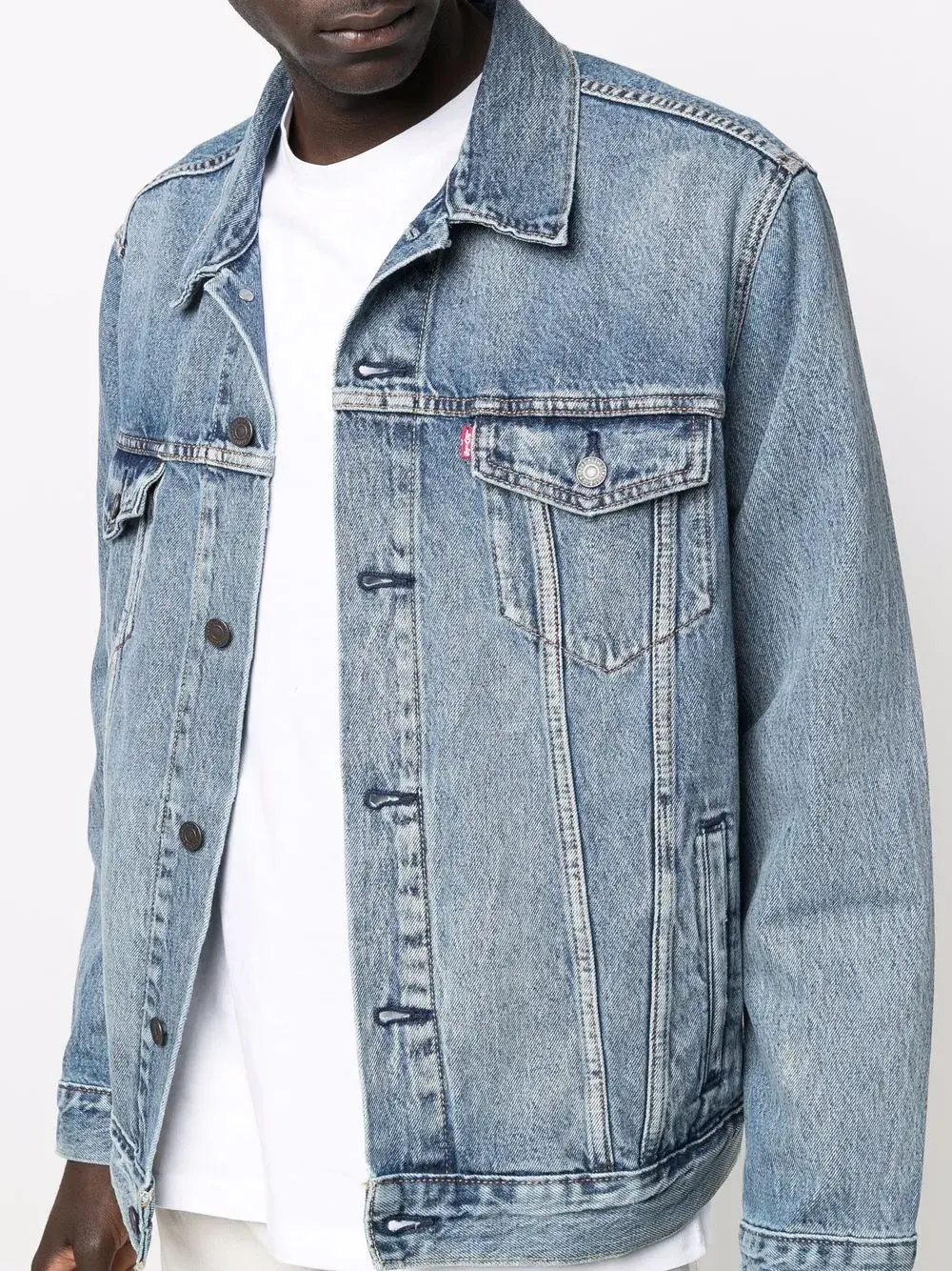 Эффект потертости, классический воротник, застежка на пуговицах спереди, длинные рукава, манжеты на пуговицах, два нагрудных кармана с клапанами, два прорезных кармана по бокам и прямой подол.
