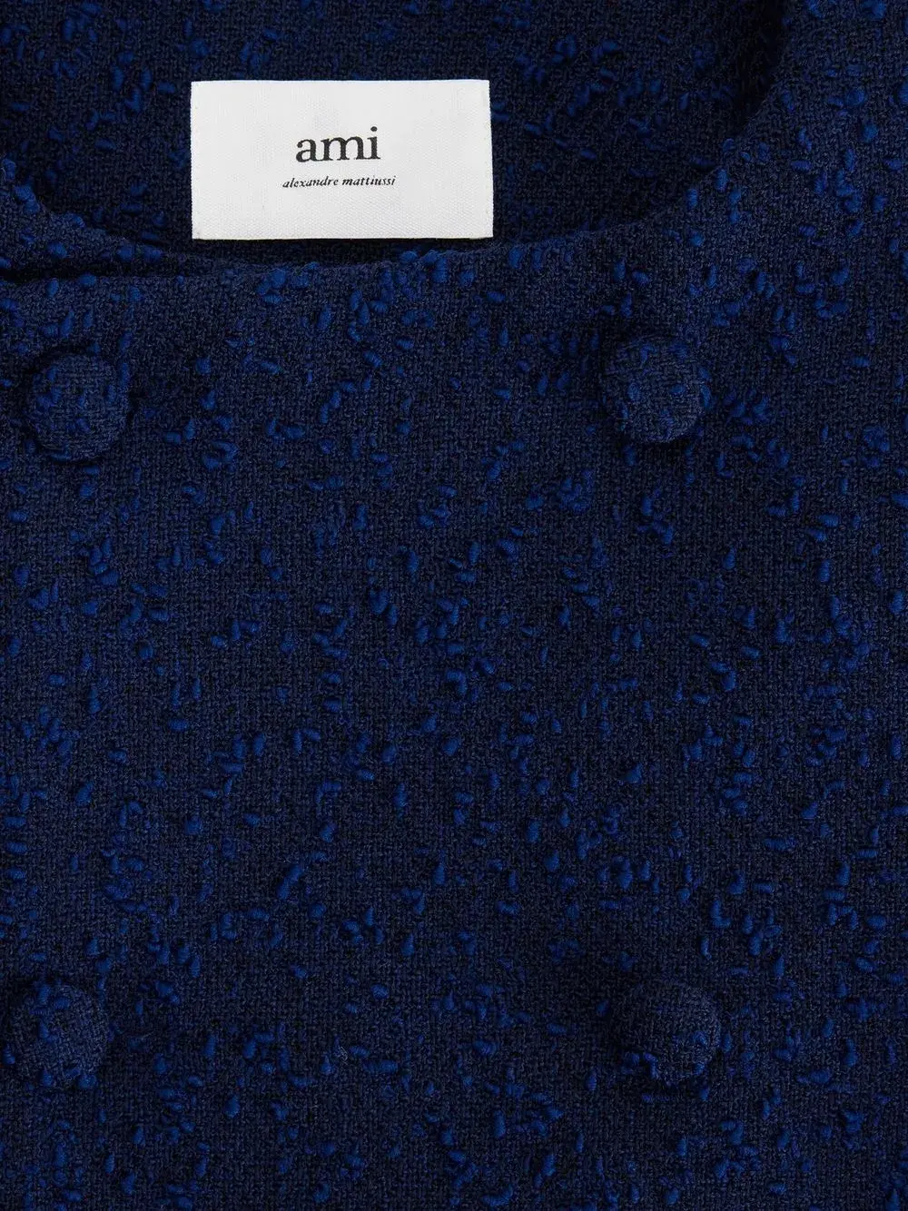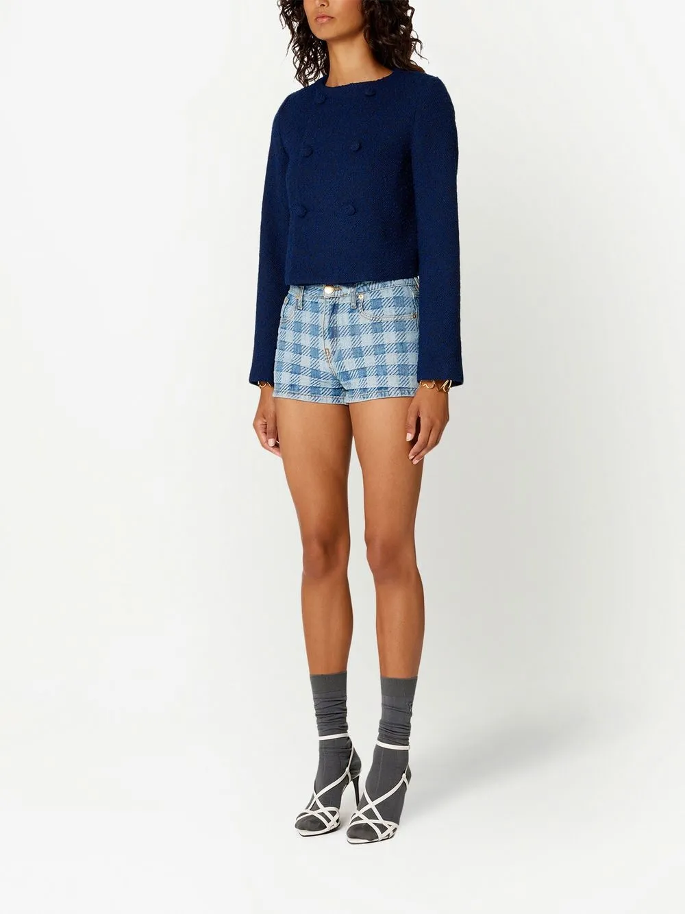 Синий, фактурная отделка, круглый вырез, длинные рукава, двубортная застежка на кнопки и укороченная длина.