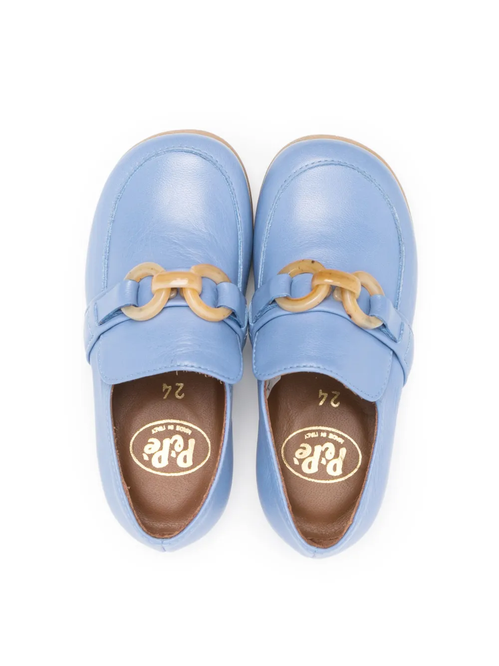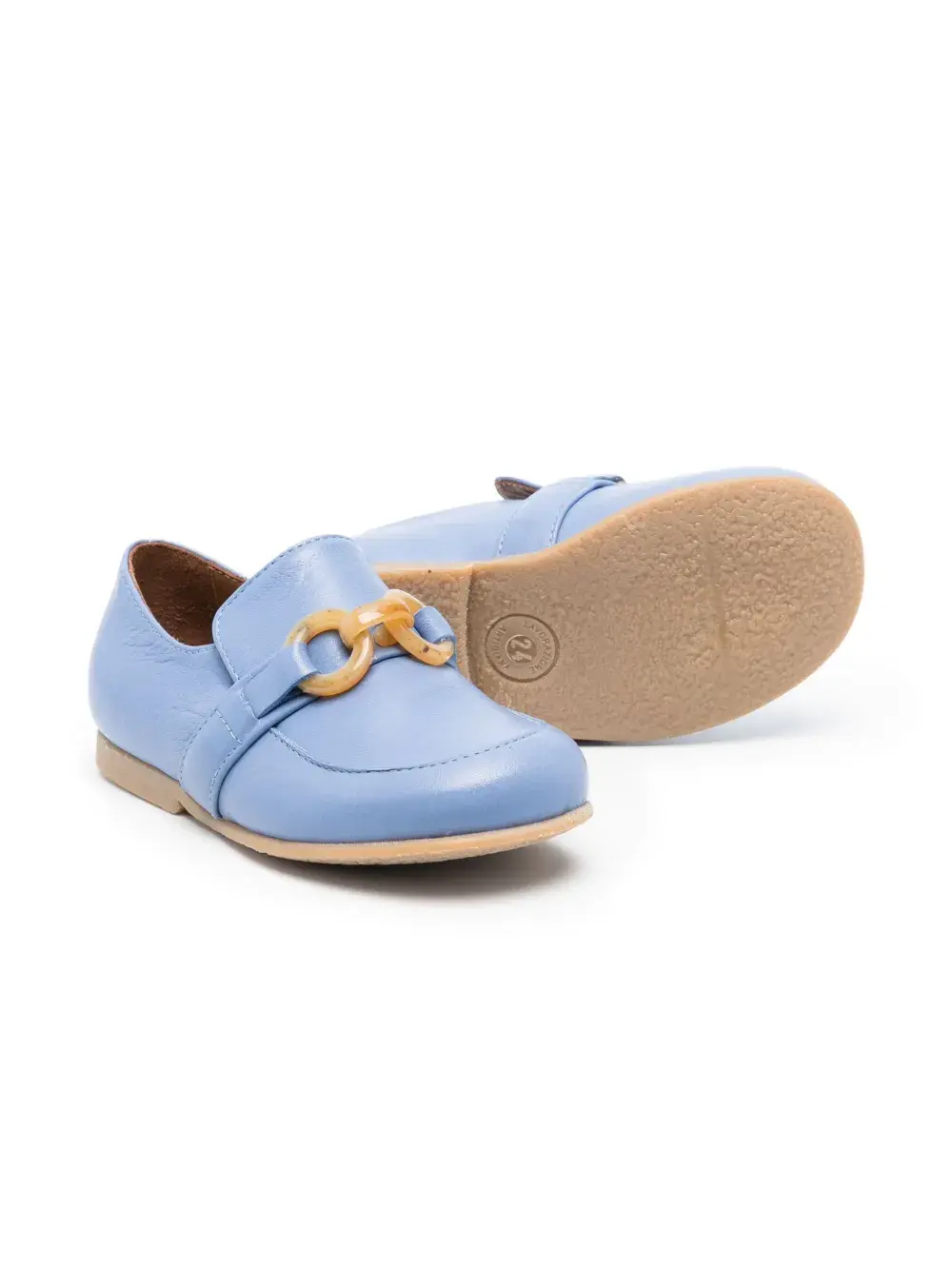 Пудрово-голубой, телячья кожа, цепочка, модель без застежки, стелька с логотипом, плоская резиновая подошва и закругленный носок.