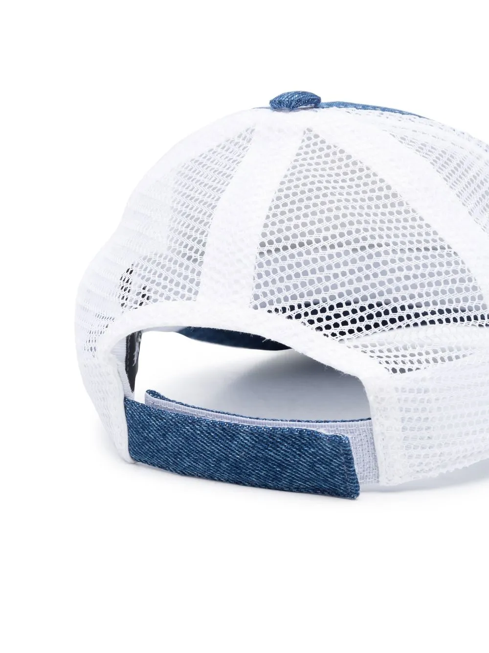Синий, белый, хлопок, эффект потертости, вышитый логотип спереди, сетчатые вставки, закругленный козырек и регулируемый дизайн.