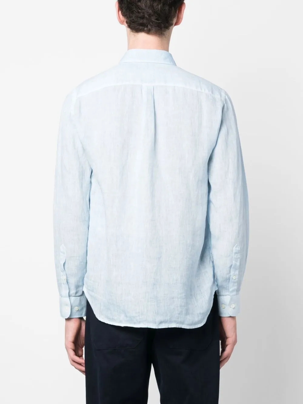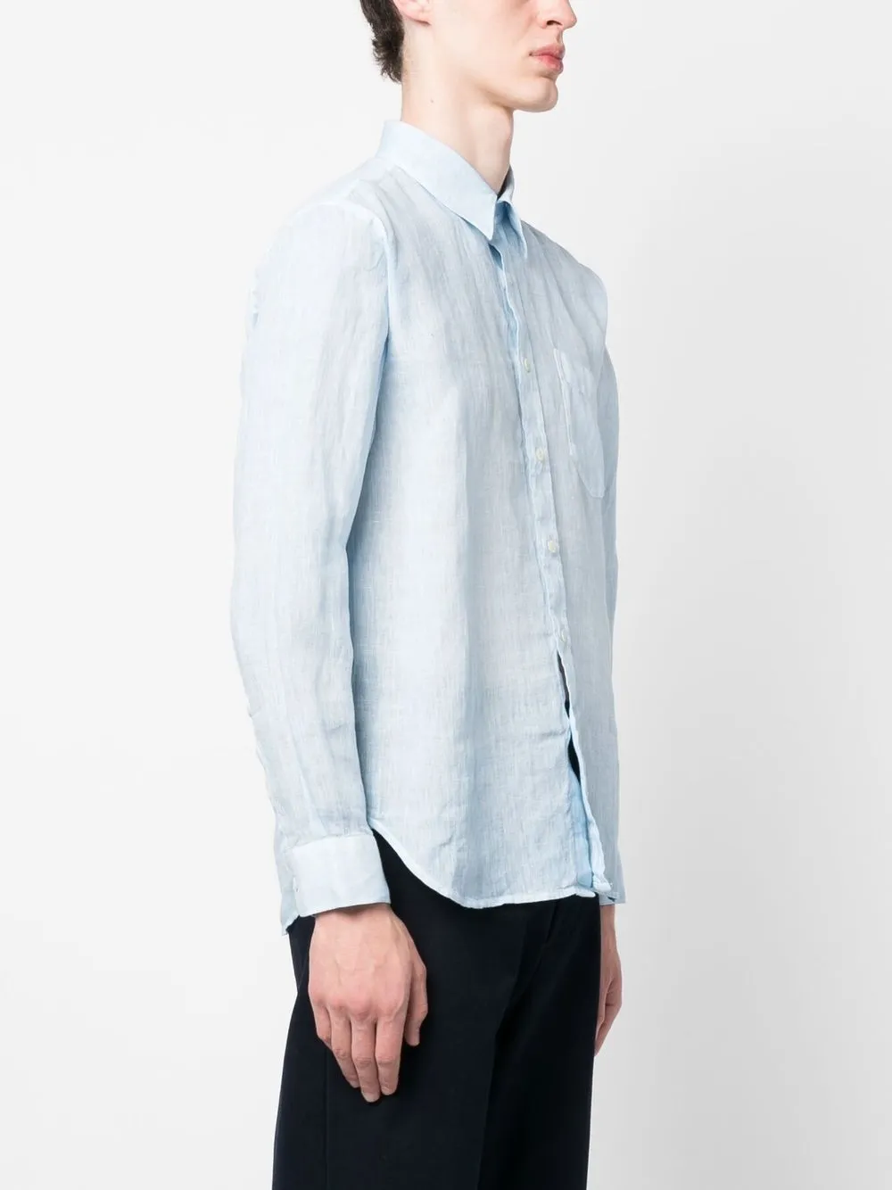 Голубой, смесовый лен, классический воротник, застежка на пуговицах спереди, нагрудный накладной карман, длинные рукава и закругленный подол. Ответственный выбор: Этот товар как минимум на 50% состоит из материалов, которые признаны более безопасными для окружающей среды или сертифицированы независимыми организациями.