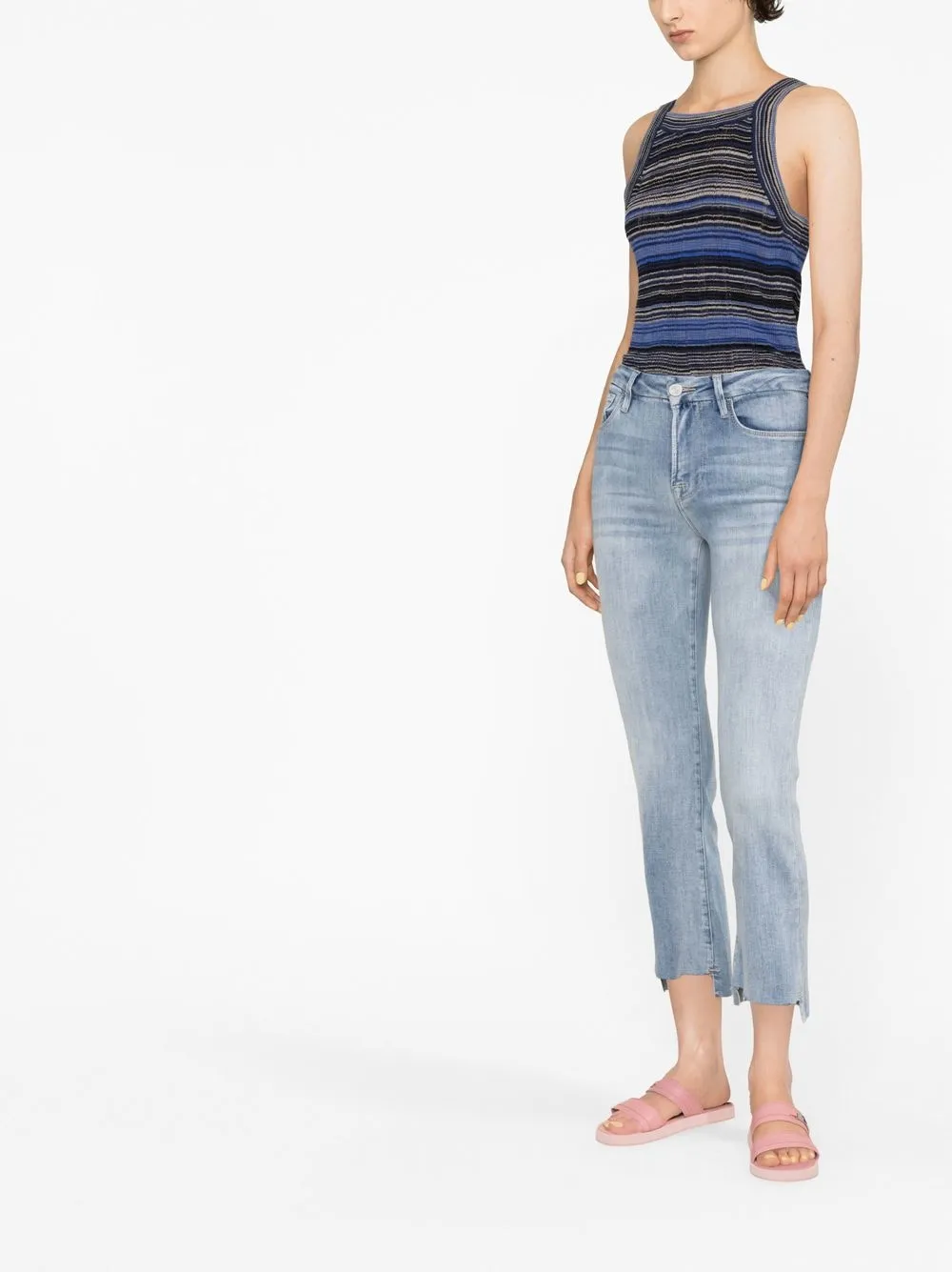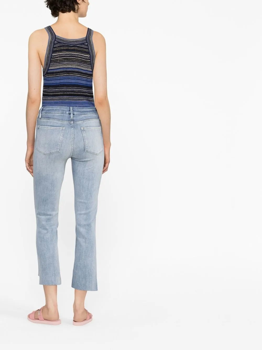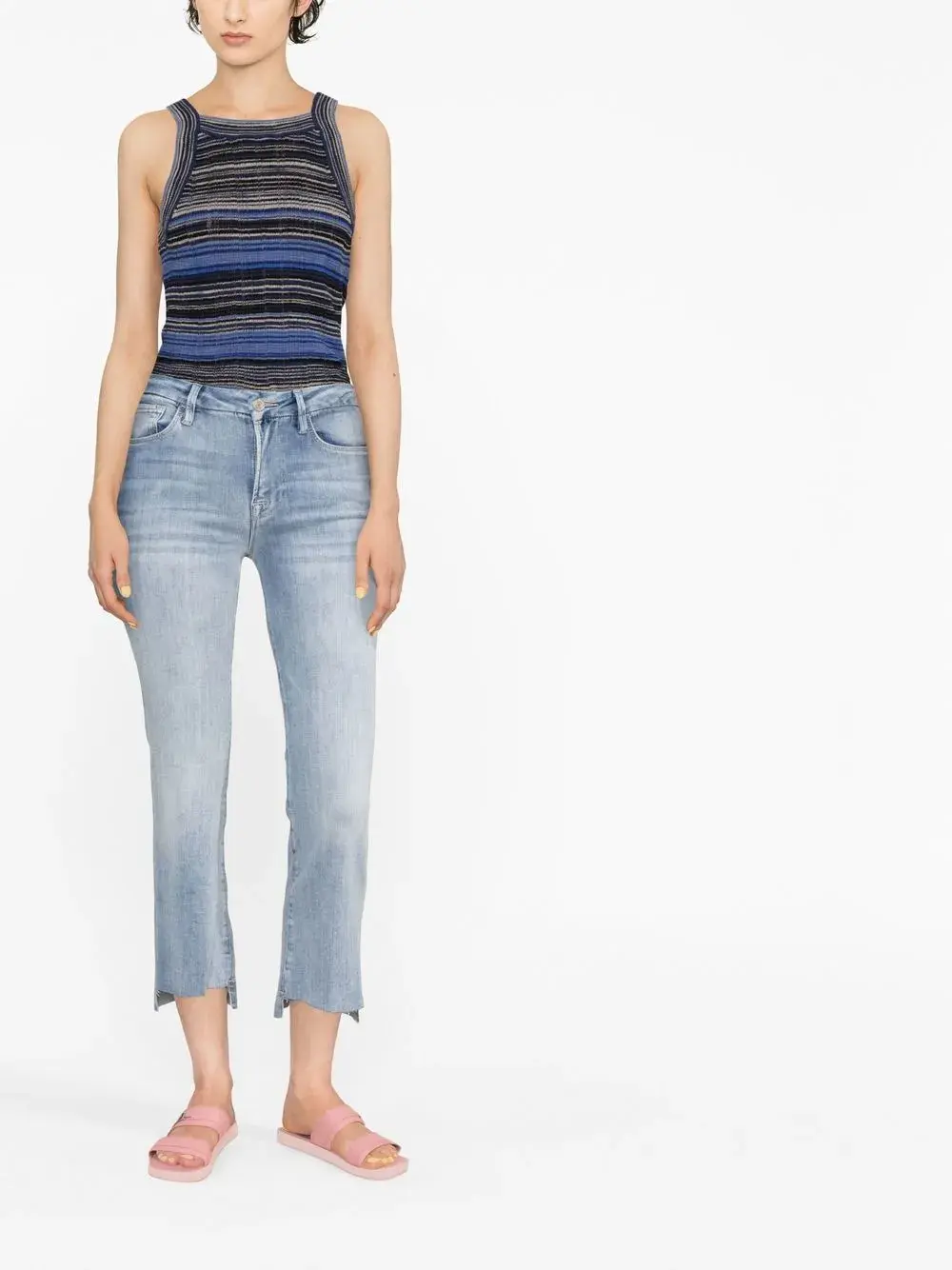 Синий, смесовый хлопок, обработанный деним, застежка на молнии и пуговице спереди, петли для ремня, пять карманов и укороченная длина.