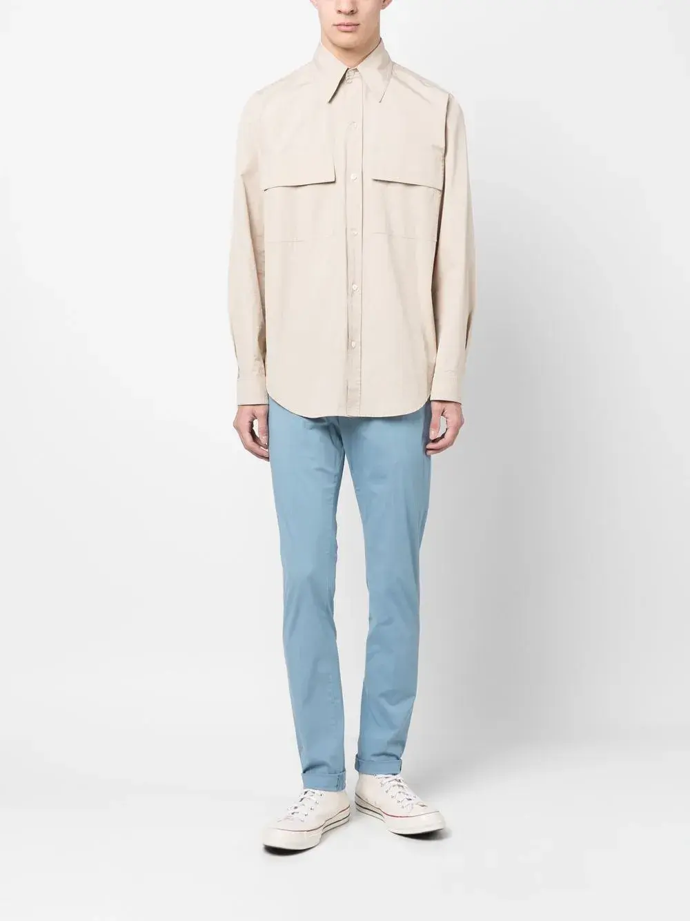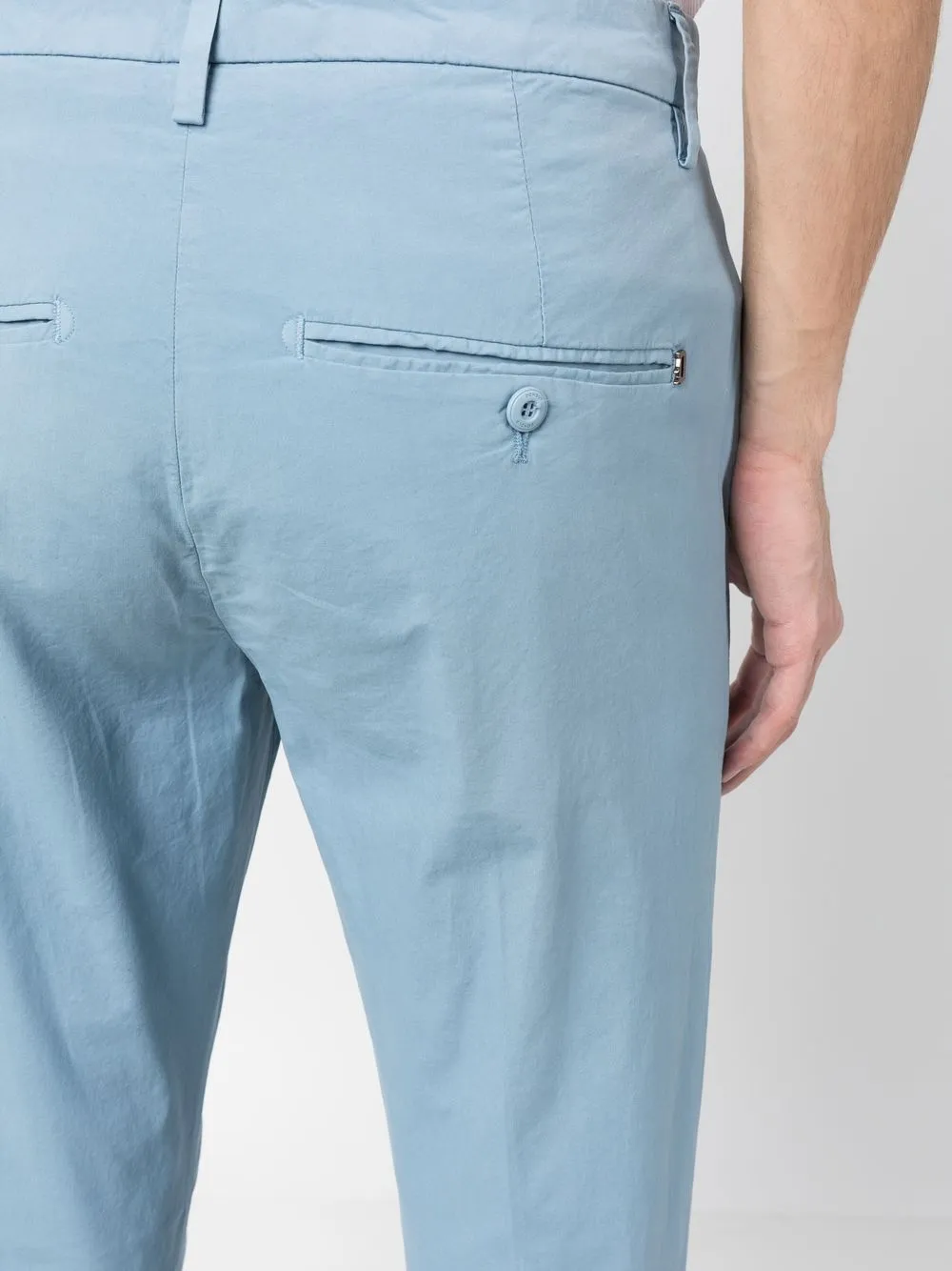 Пудрово-голубой, эластичный хлопок, строгий крой, потайная застежка спереди, два прорезных кармана по бокам и два прорезных кармана на пуговицах сзади.