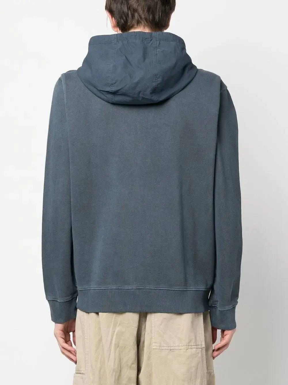 Синий, хлопок, вышитый логотип на груди, затягивающийся на шнурок капюшон, застежка на молнии спереди, длинные рукава и карман-муфта.