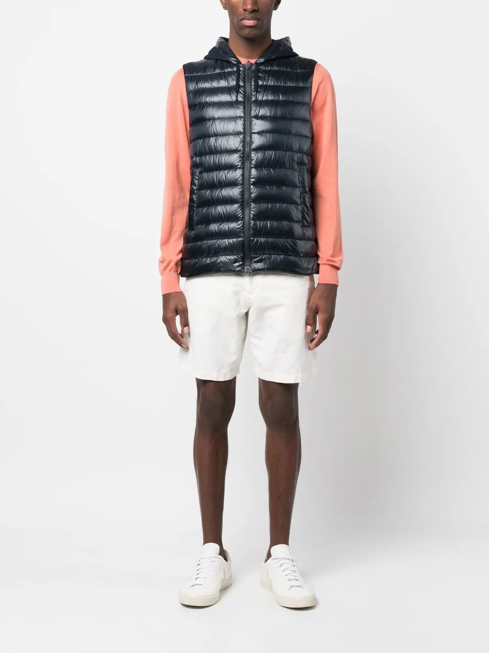 Темно-синий, стеганая модель, дутый материал, вставки, серебристый металлический логотип, затягивающийся на шнурок капюшон, застежка на молнии спереди, круглый вырез, без рукавов и прямой подол.