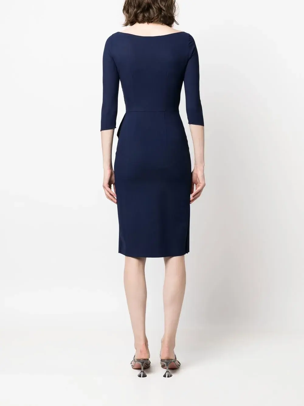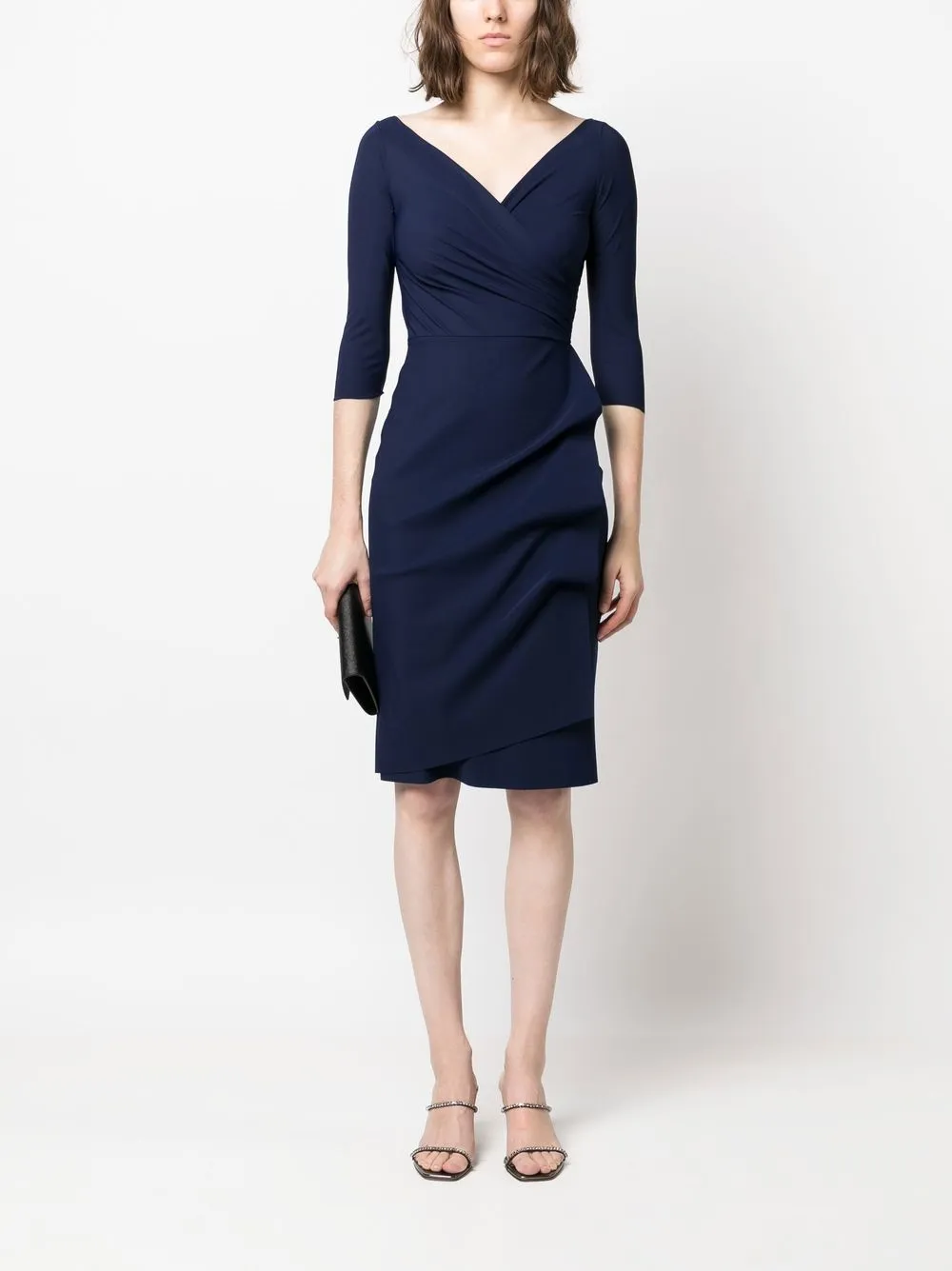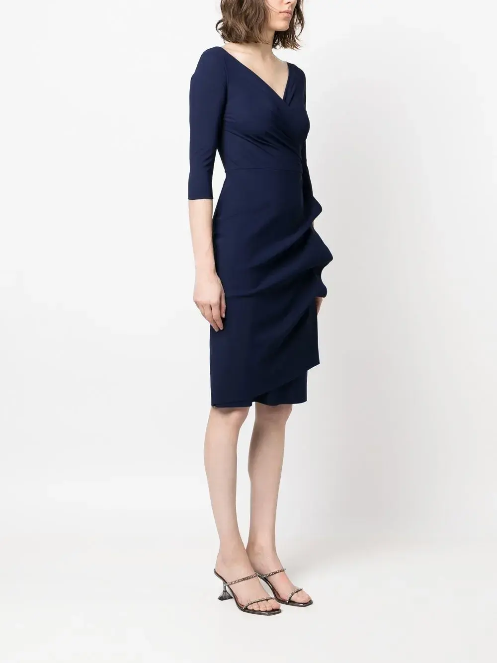 Темно-синий, модель на запах, дизайн со сборками, V-образный вырез, рукава по локоть, прямой подол и длина миди.