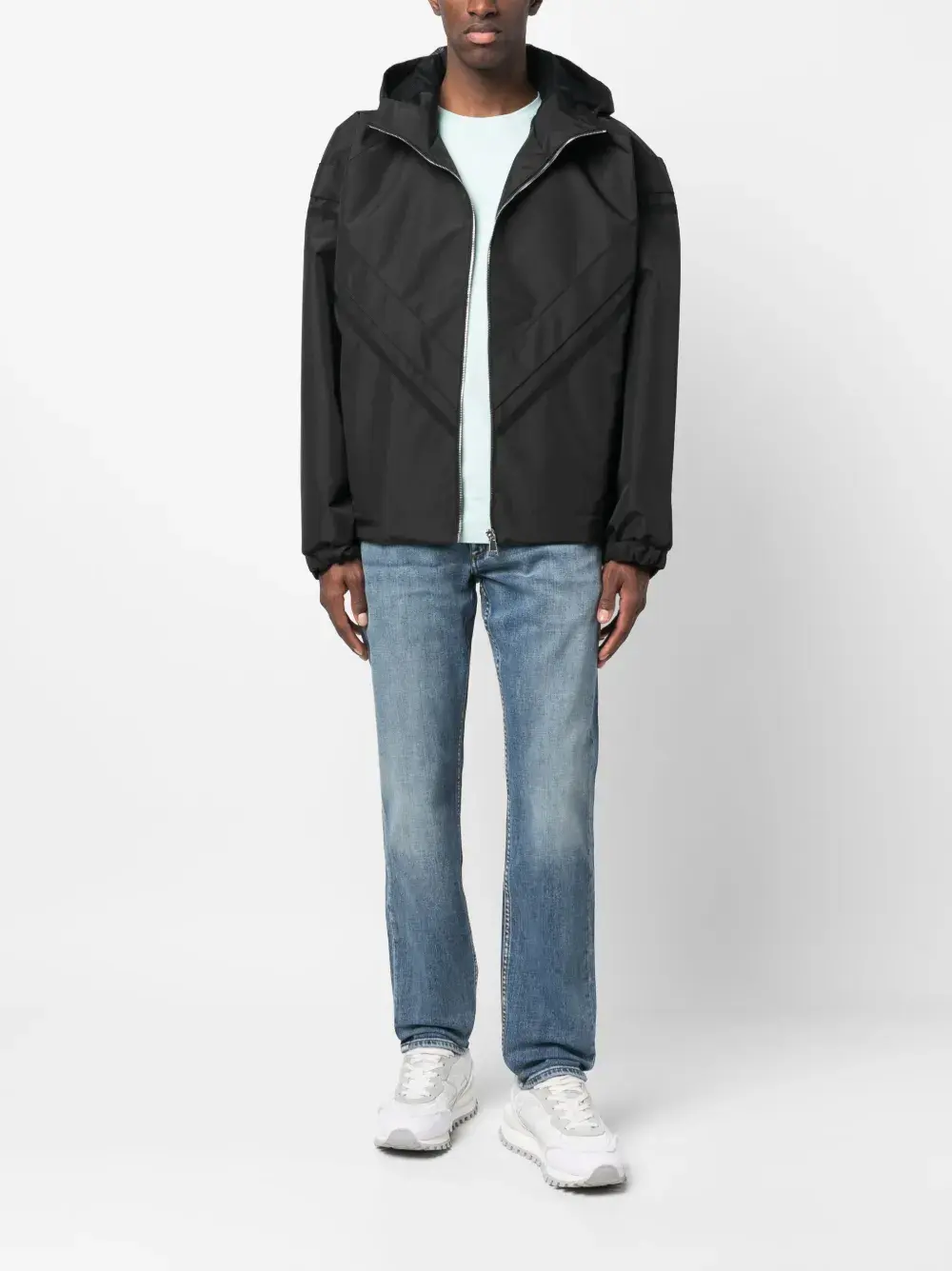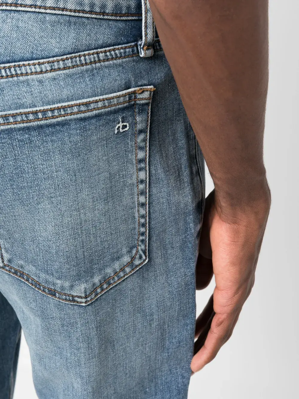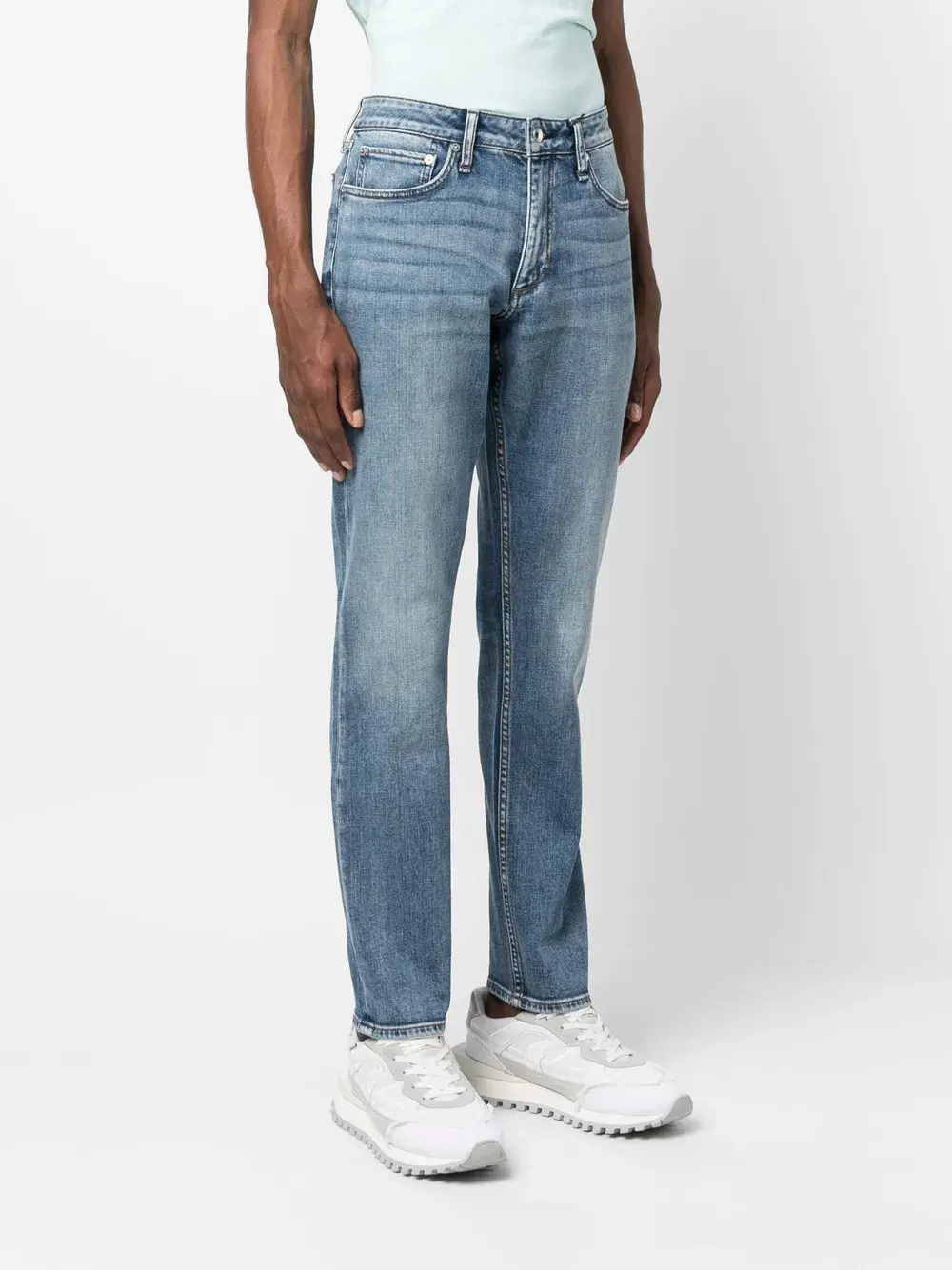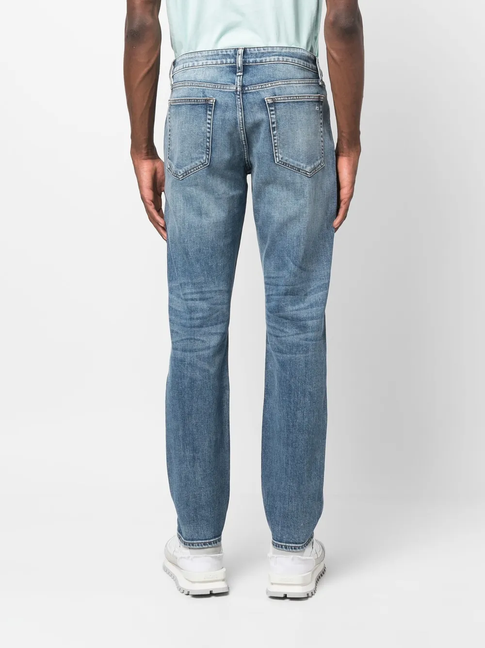 Голубой, эластичный хлопок, обработанный деним, прямой крой, петли для ремня, застежка на молнии и пуговице спереди и пять карманов.