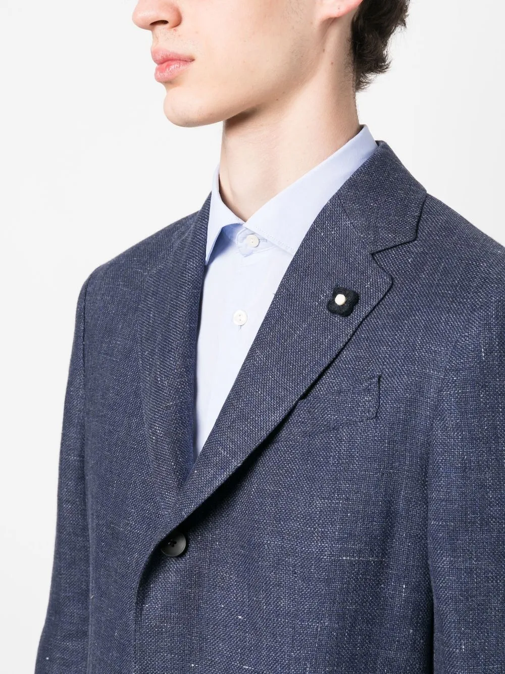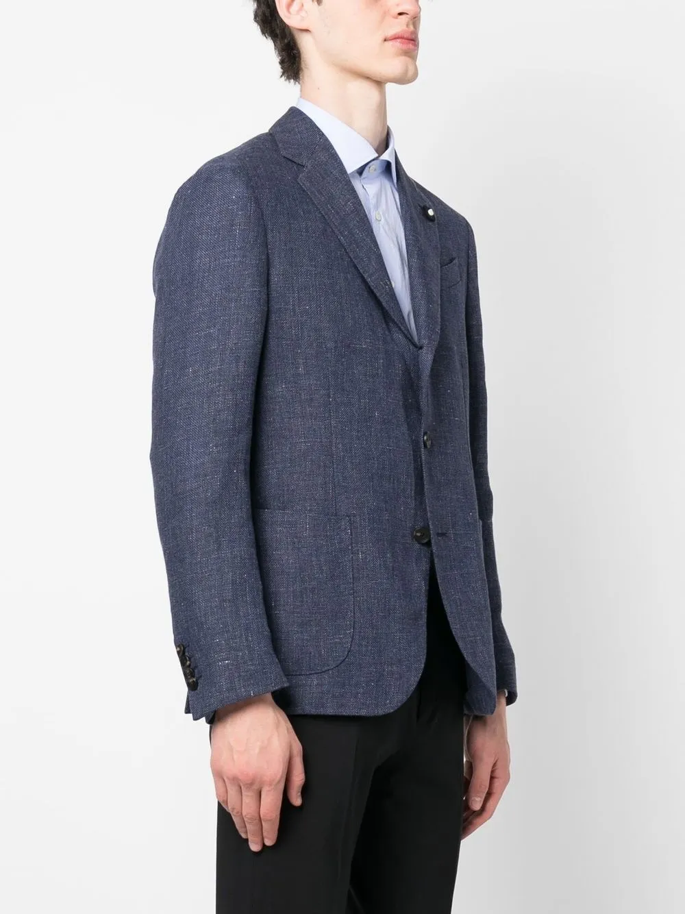 Подробнее о товаре: Синий, смесь льна и шерсти, фактурная поверхность, декоративная брошь, зазубренные лацканы, застежка на пуговицах спереди, нагрудный прорезной карман, два накладных кармана спереди, рукава с манжетами на пуговицах и две боковые шлицы сзади. Этот товар как минимум на 50% состоит из материалов, которые признаны более безопасными для окружающей среды, и/или произведены с использованием методов, которые помогают сократить потребление воды и химических веществ. Узнать больше о том, какие товары получают отметку «Ответственный выбор», можно из материала «Как мы оцениваем экологичность и этичность».
