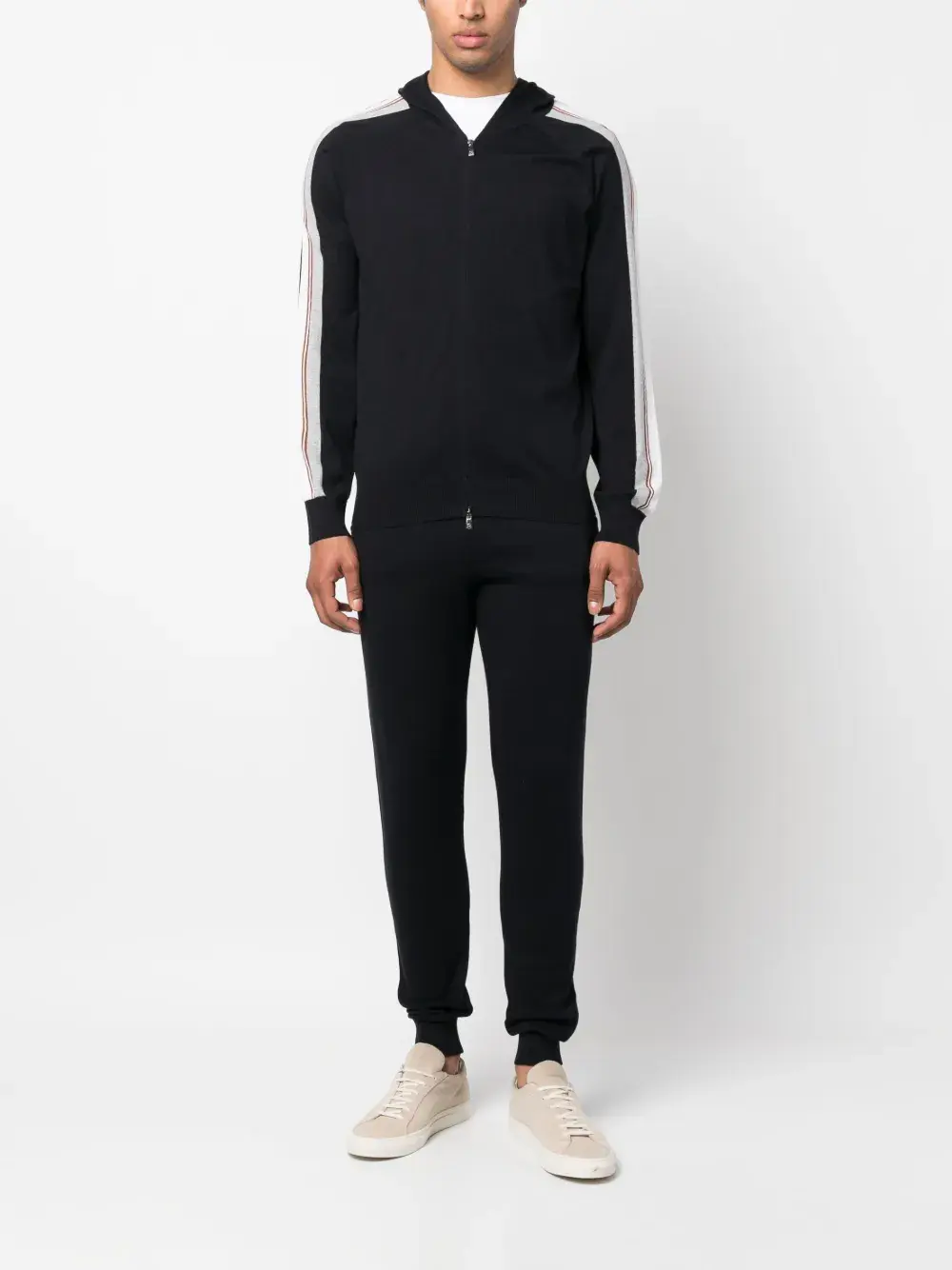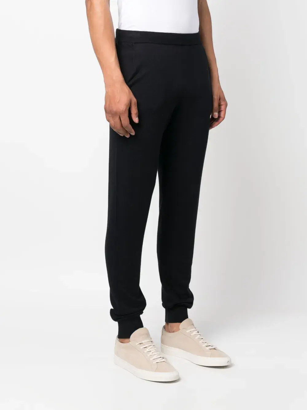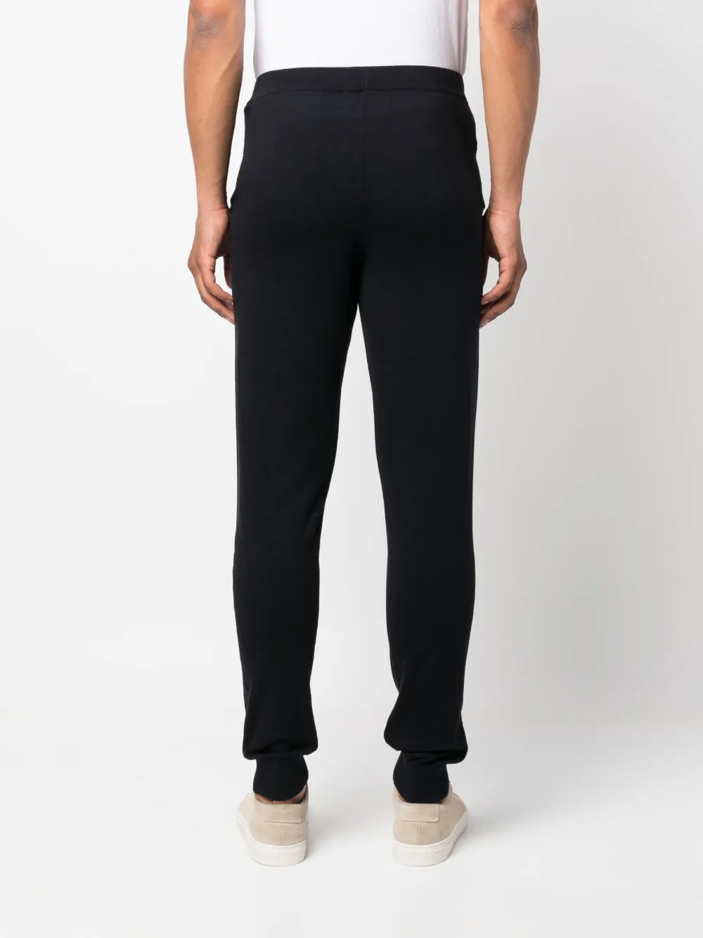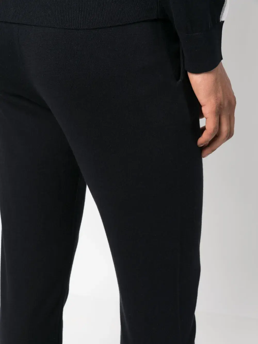Темно-синий, смесь хлопка и кашемира, узкий крой, эластичный пояс, два вшитых кармана по бокам и манжеты в рубчик.