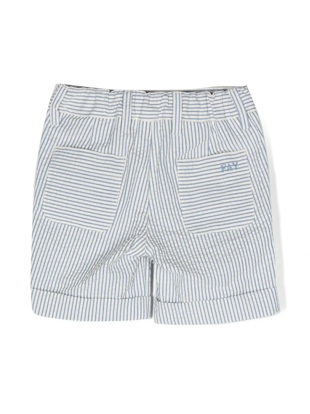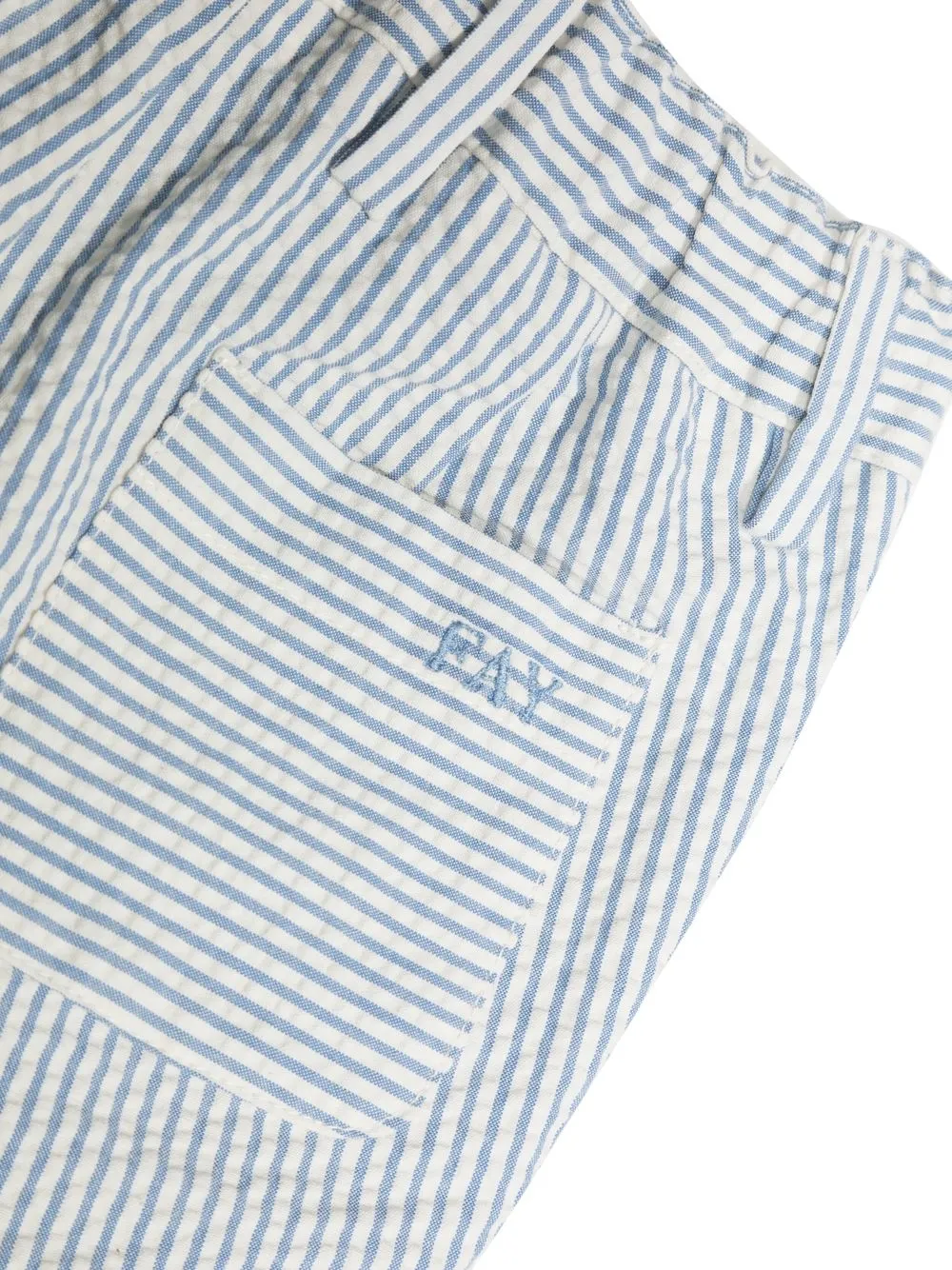 Белый, синий, хлопок, узор в полоску, вышитый логотип сзади, подвернутые манжеты, эластичный пояс, застежка на пуговицах спереди, два кармана по бокам, петли для ремня и два накладных кармана сзади.