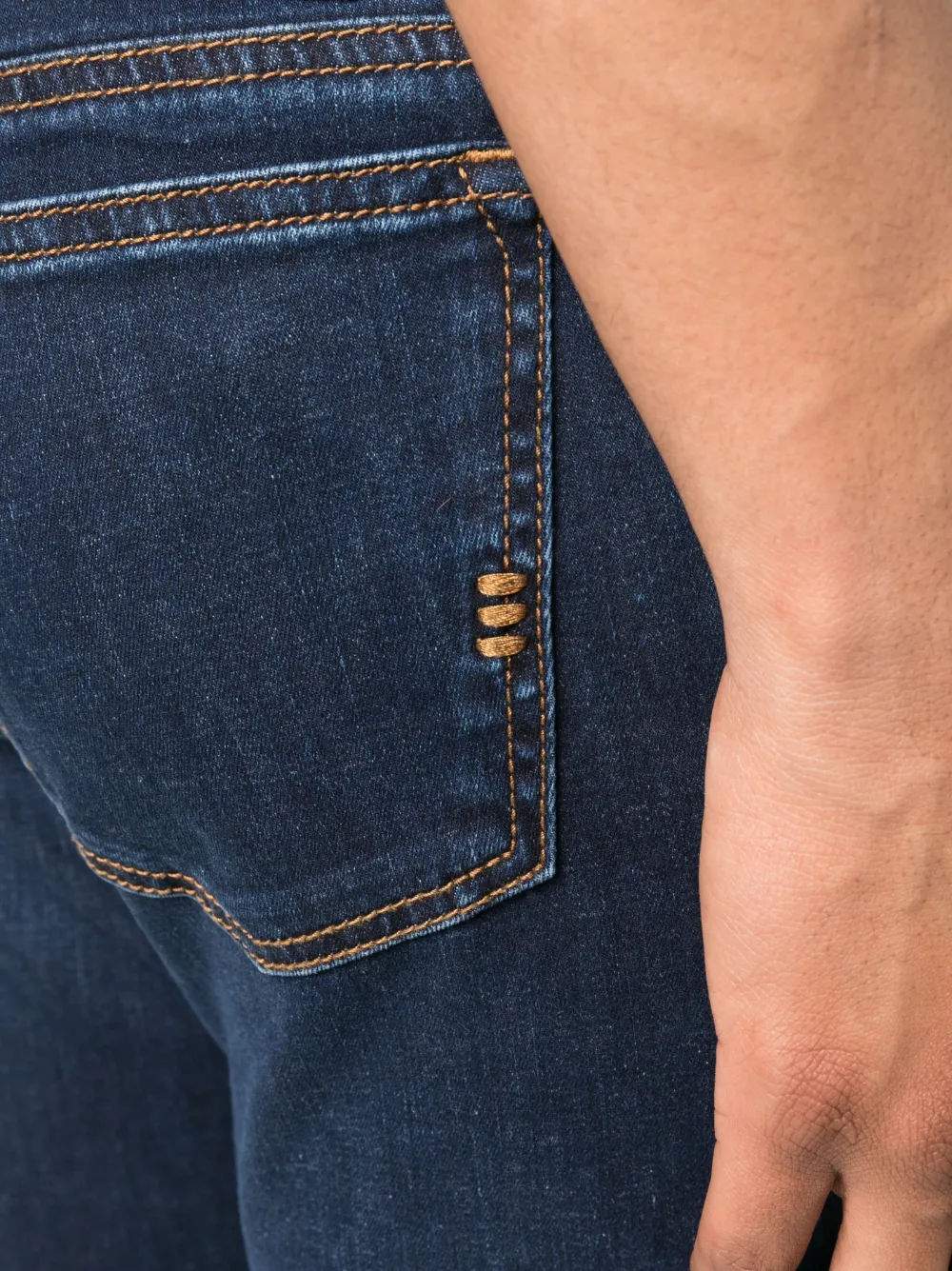 Индиго, эластичный хлопок, низкая посадка, застежка на молнии и пуговице спереди, петли для ремня и пять карманов.