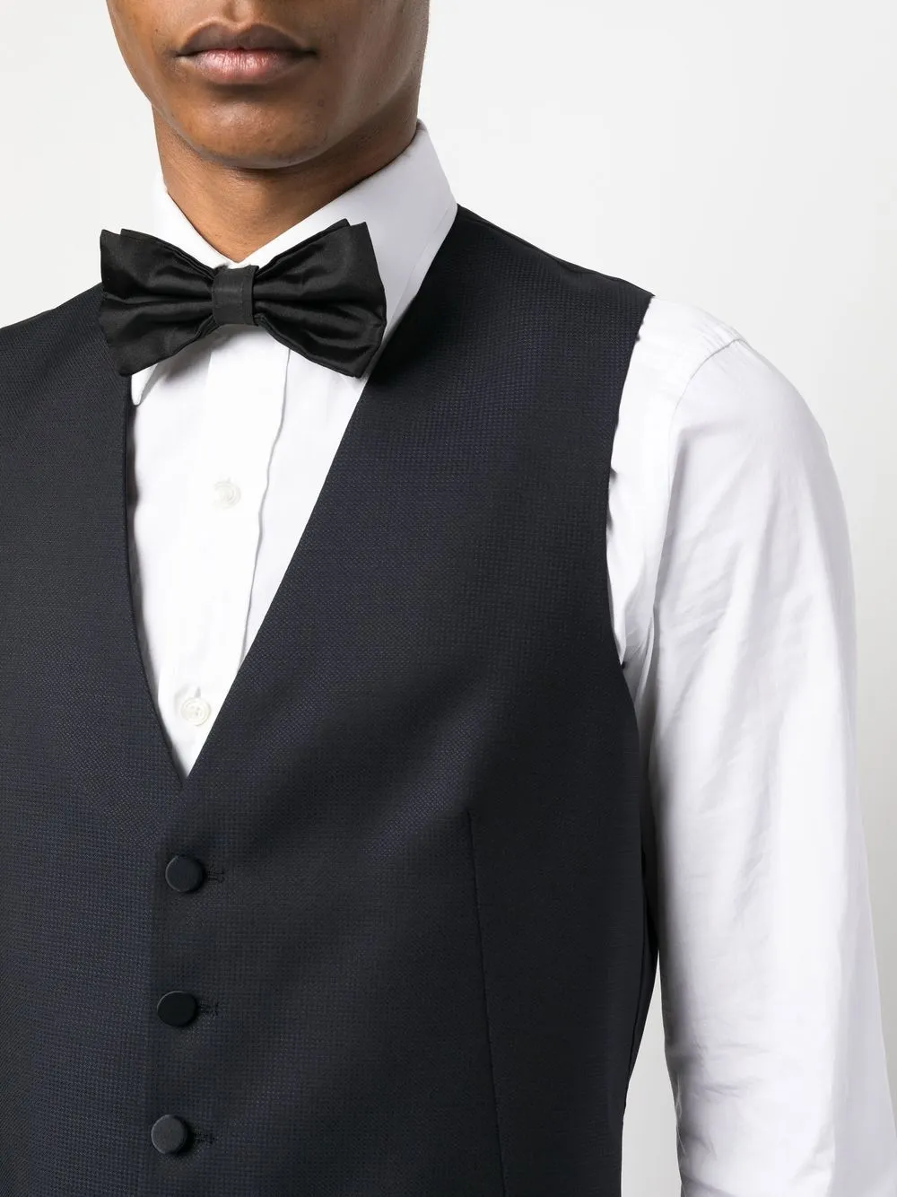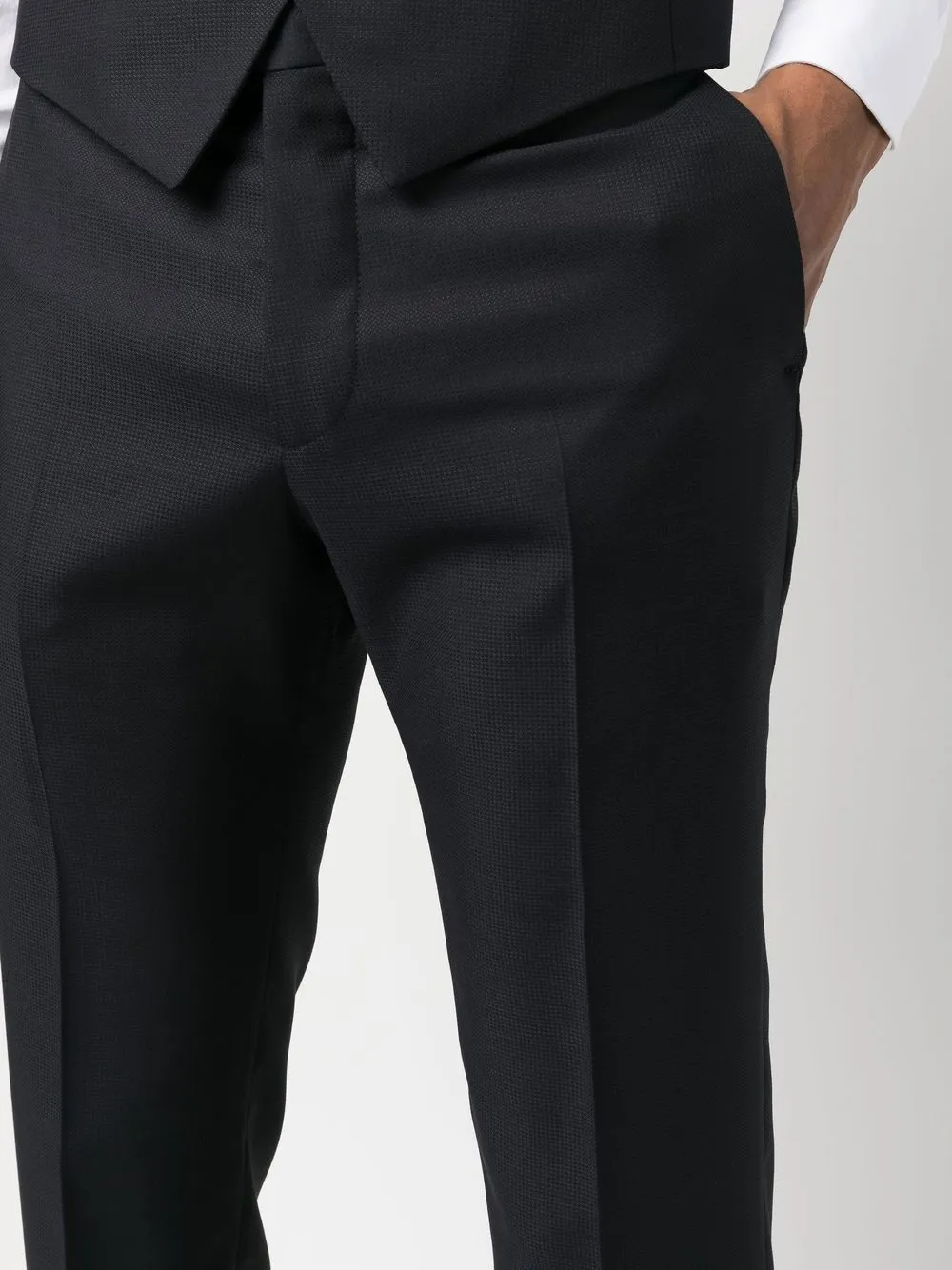 Темно-синий, смесь шелка и вирджинской шерсти, заостренные лацканы, застежка на пуговицах спереди, прорезной карман на груди, два передних кармана с листочкой, длинные рукава, петли для ремня, потайная застежка спереди, прямой крой и два кармана по бокам.