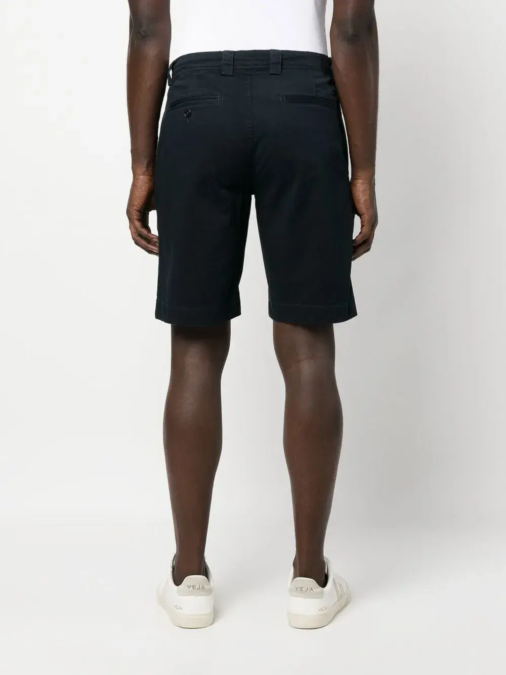 Темно-синий, эластичный хлопок, прямой крой, застежка на молнии и пуговице спереди, прорезные карманы по бокам и два кармана с листочкой сзади.