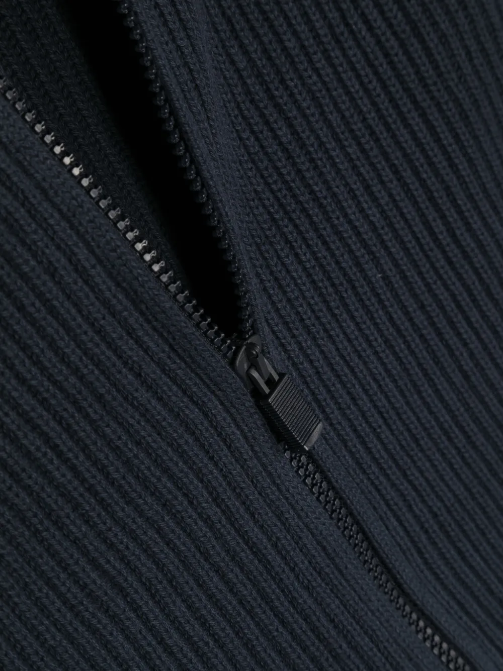 Темно-синий, хлопок, трикотаж в рубчик, маленькая подвеска с логотипом, высокий воротник, застежка на молнии спереди, длинные рукава и прямой подол.