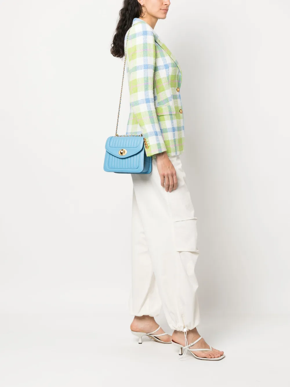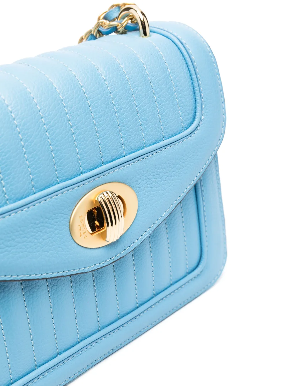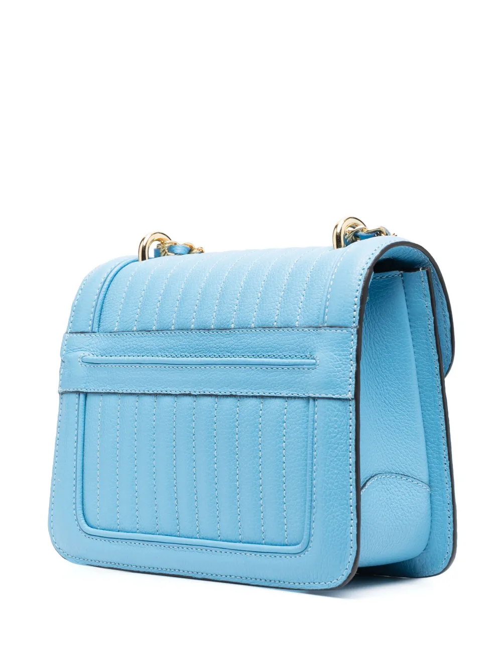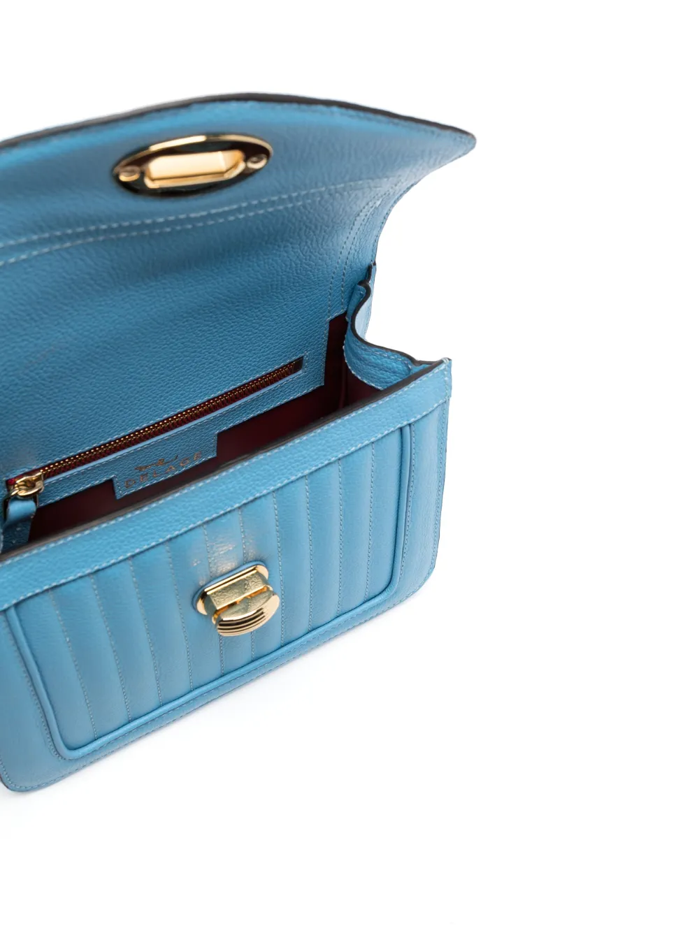 Голубой, кожа, зернистая текстура, вставки, откидной клапан, застежка с поворачивающимся замком, ремешок-цепочка на плечо, основное отделение, прорезной карман сзади и внутренний карман на молнии.